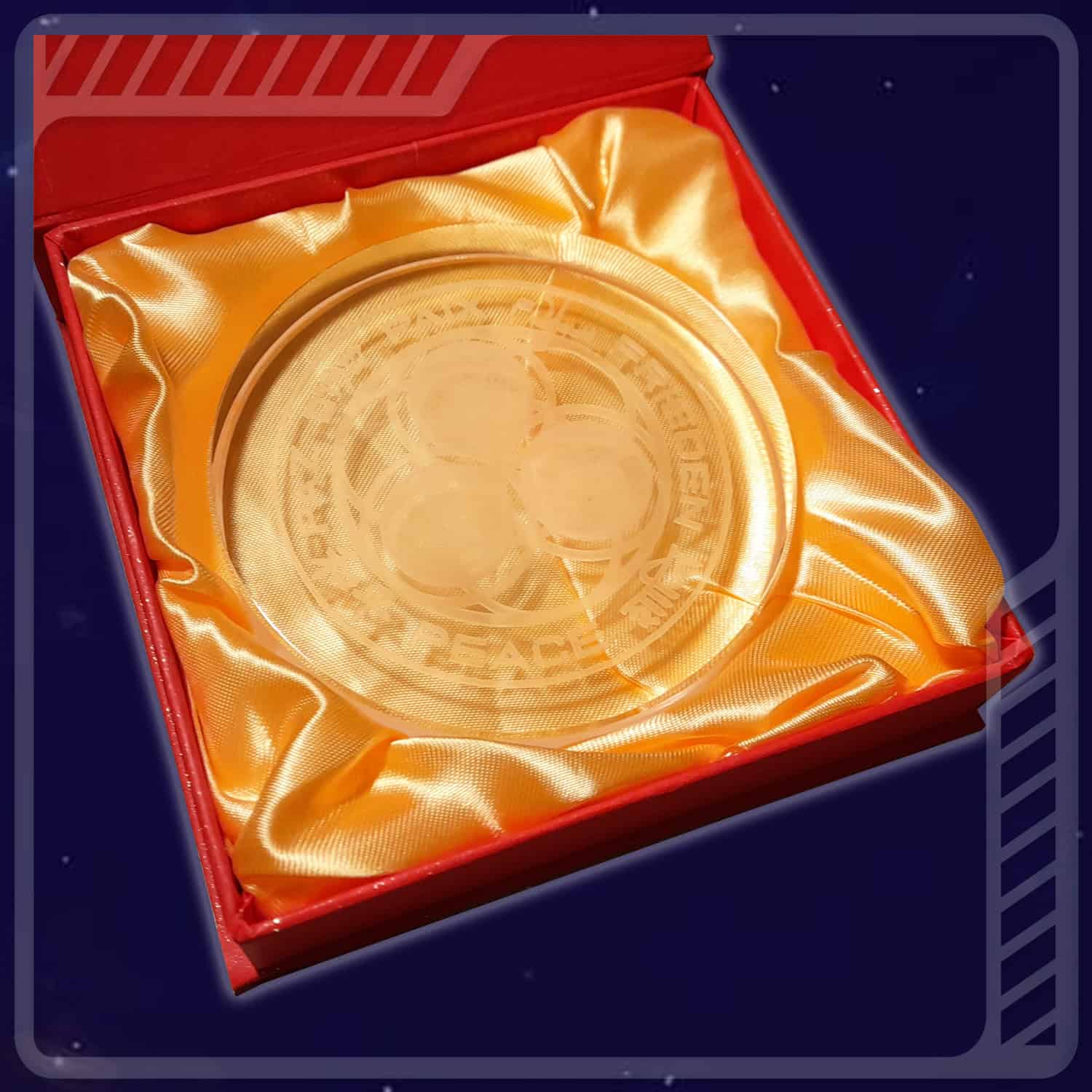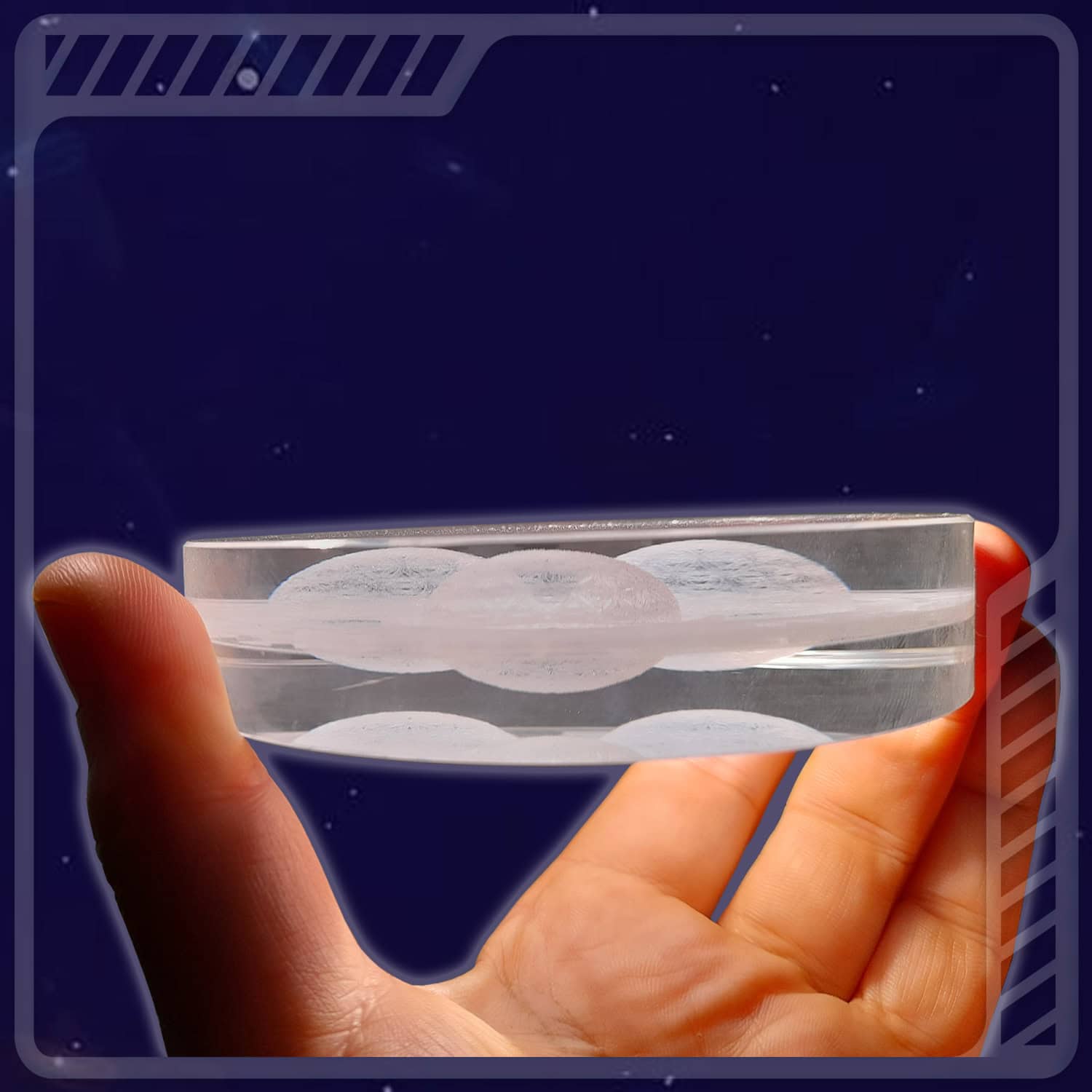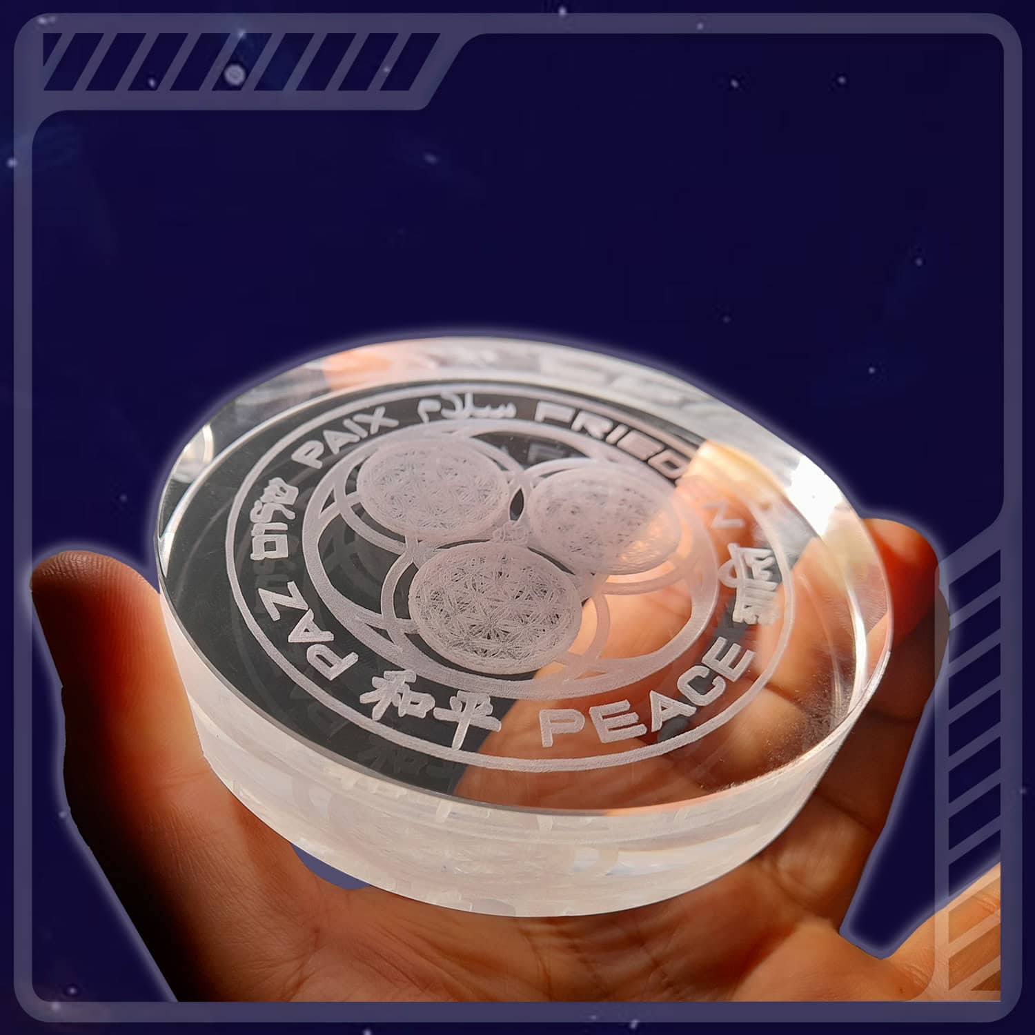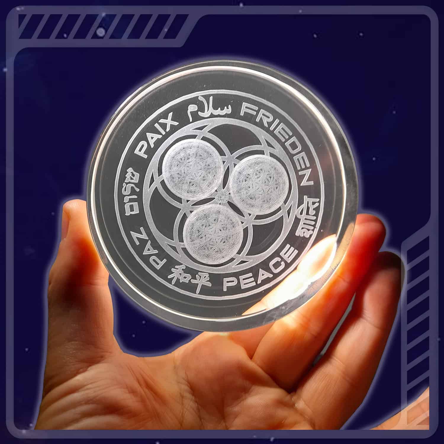 Réalisée en cristal K9, un verre de qualité optique d’une pureté exceptionnelle sans plomb dans sa constitution, d’un diamètre de 100 mm et de 20 mm d’épaisseur (130 mm et 30 mm pour la version plasmique), la Graine de Vie de Paix Universelle laisse parfaitement passer à travers elle tout le spectre lumineux ainsi que les ondes scalaires et plasmas, tout en les informant à travers l’hologramme réalisé au nombre d’or (valeur Phi).