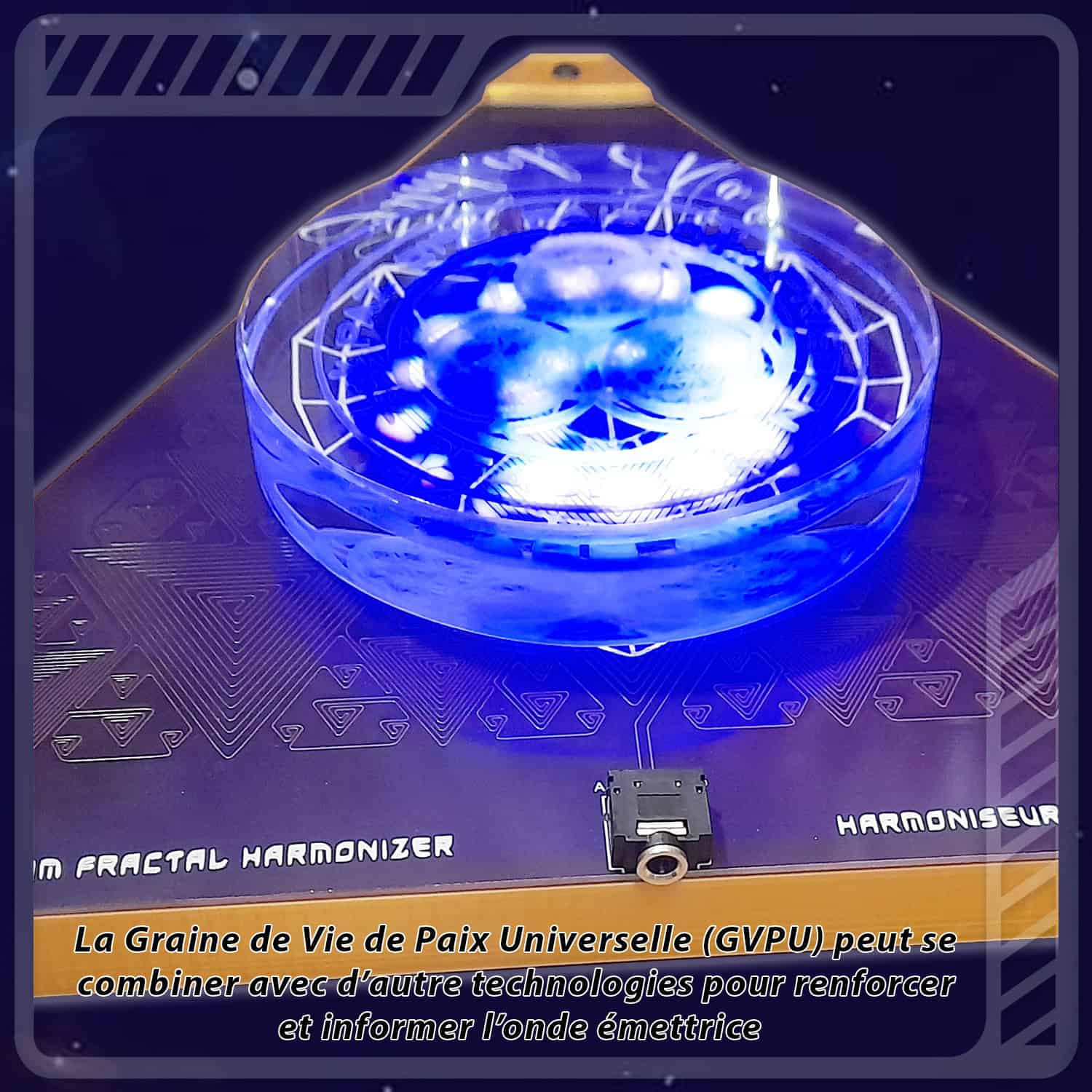 La Graine de Vie de Paix Universelle (GVPU) est un nouveau catalyseur holographique élaboré dans le but d’œuvrer concrètement et efficacement sur l’énergie de la Paix à travers le champ morphogénétique planétaire. Reprenant le puissant symbole énergétique de la Bannière de la Paix, l’objectif de cette technologie de verre gravé d’un hologramme, est de promouvoir une paix globale et durable à travers ce catalyseur combiné ou non a une technologie plasmo-scalaire.