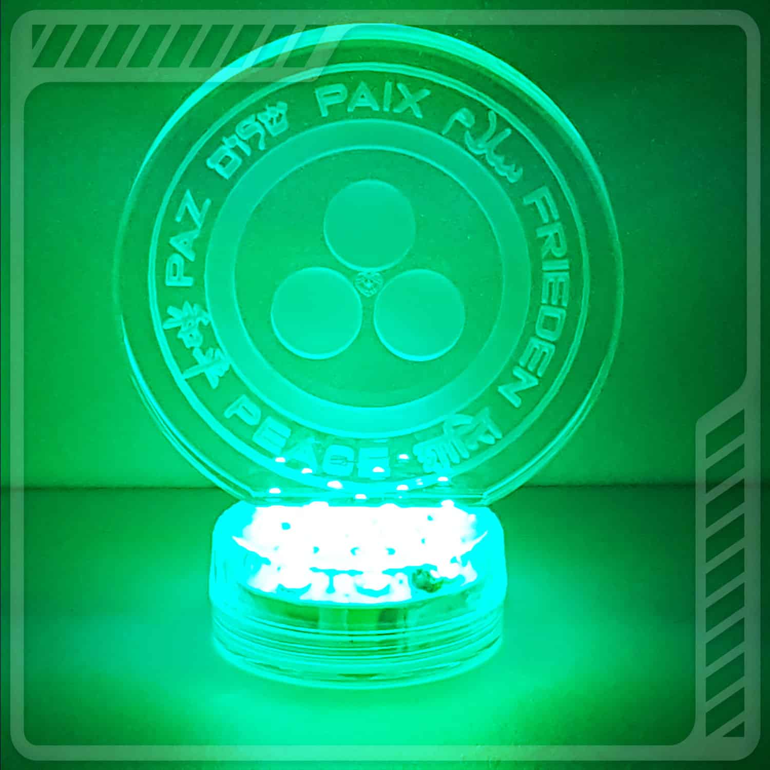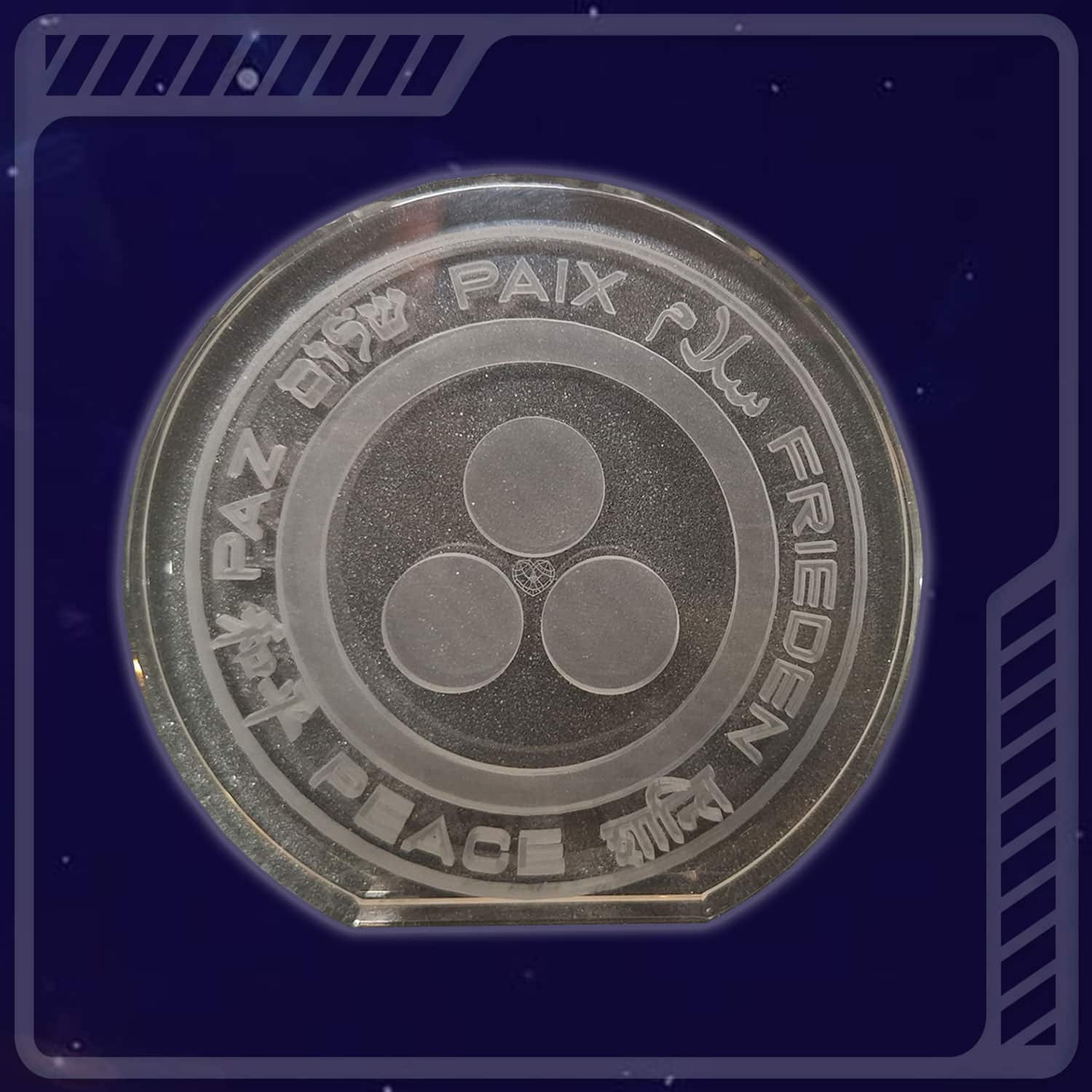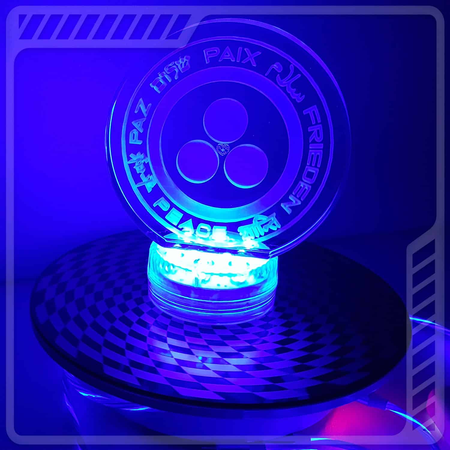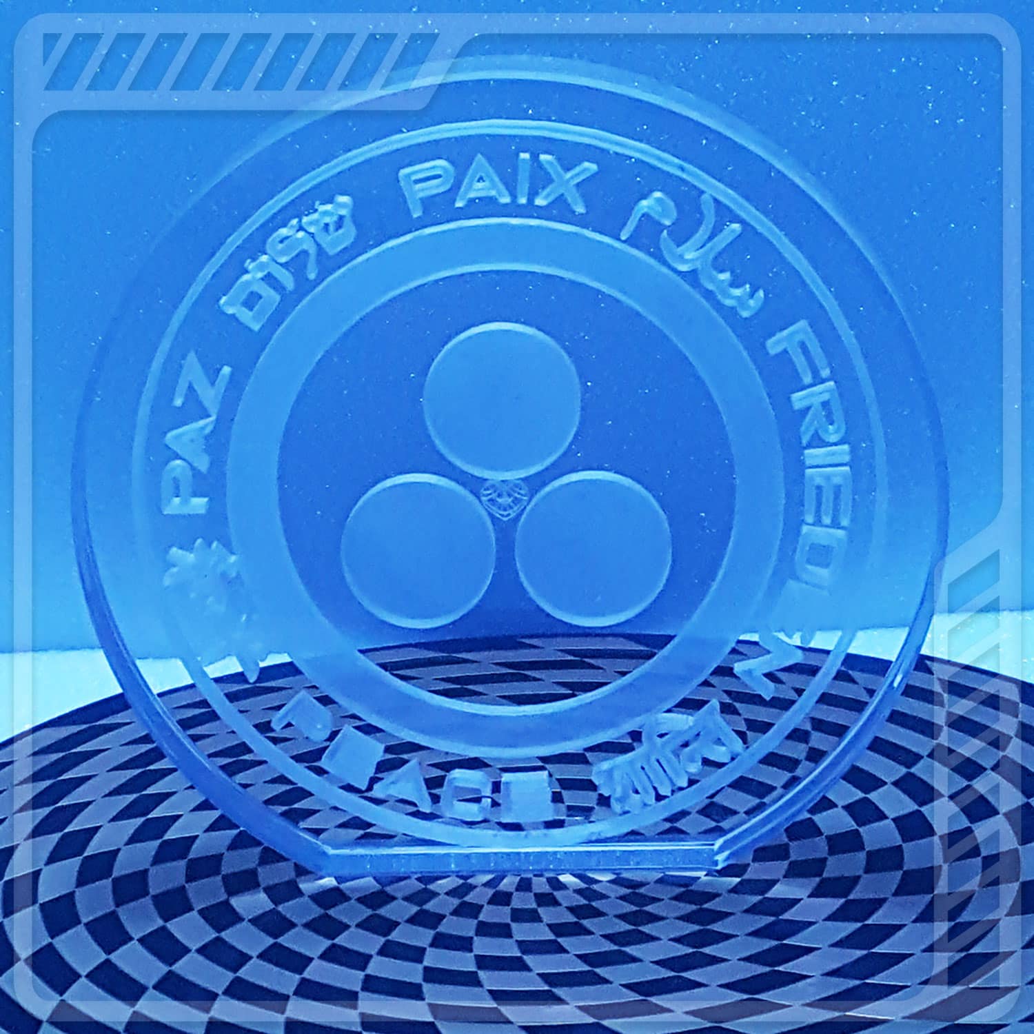 L’hologramme de la Bannière de la Paix est une création originale de Crystal of Na’amia Technologies, qui englobe autour du symbole classique du « Pacte de la Paix » initié par Nicolas Roerich dans les années 30, le mot PAIX en huit langues différentes et un petit cœur au centre, symbole de la vibration Amour-Lumière qui ouvre cette nouvelle ère de l’humanité.
