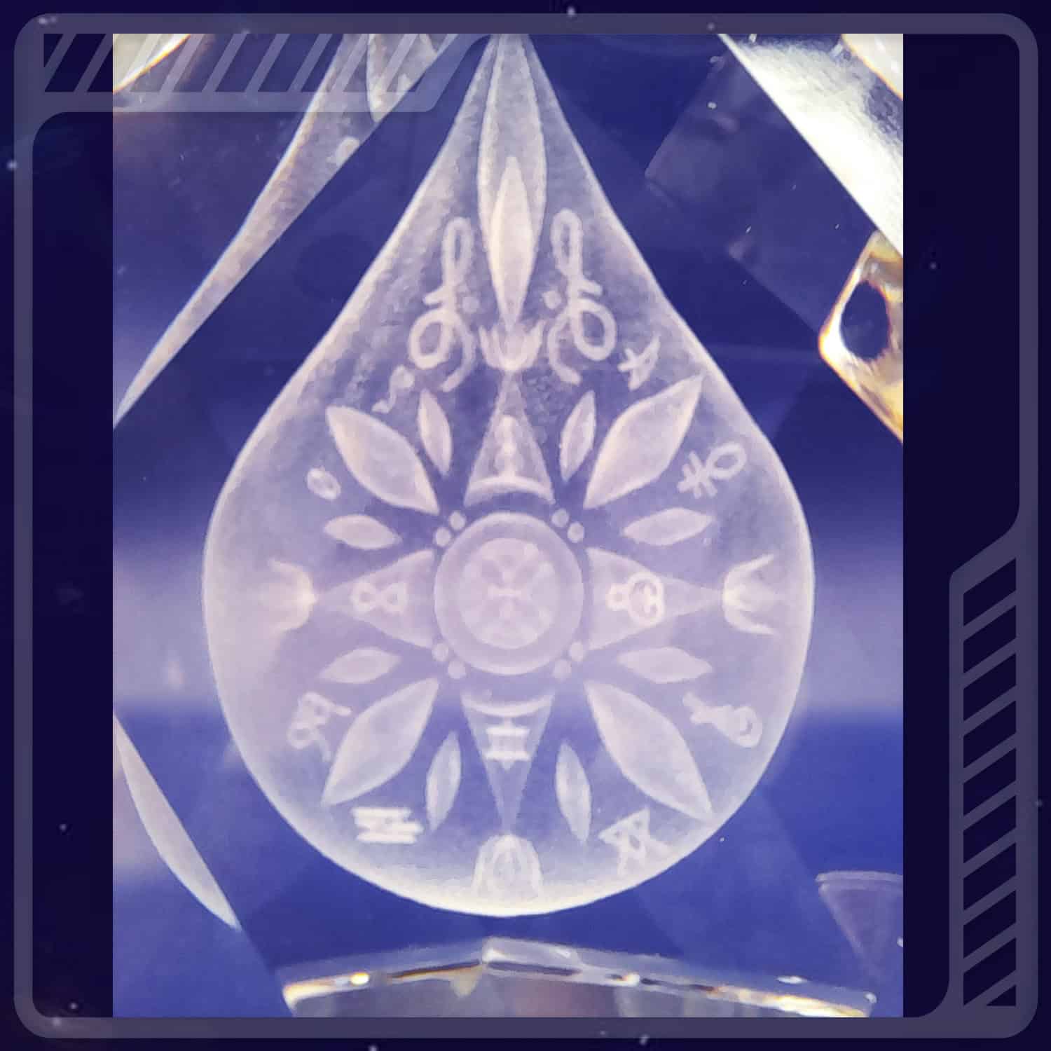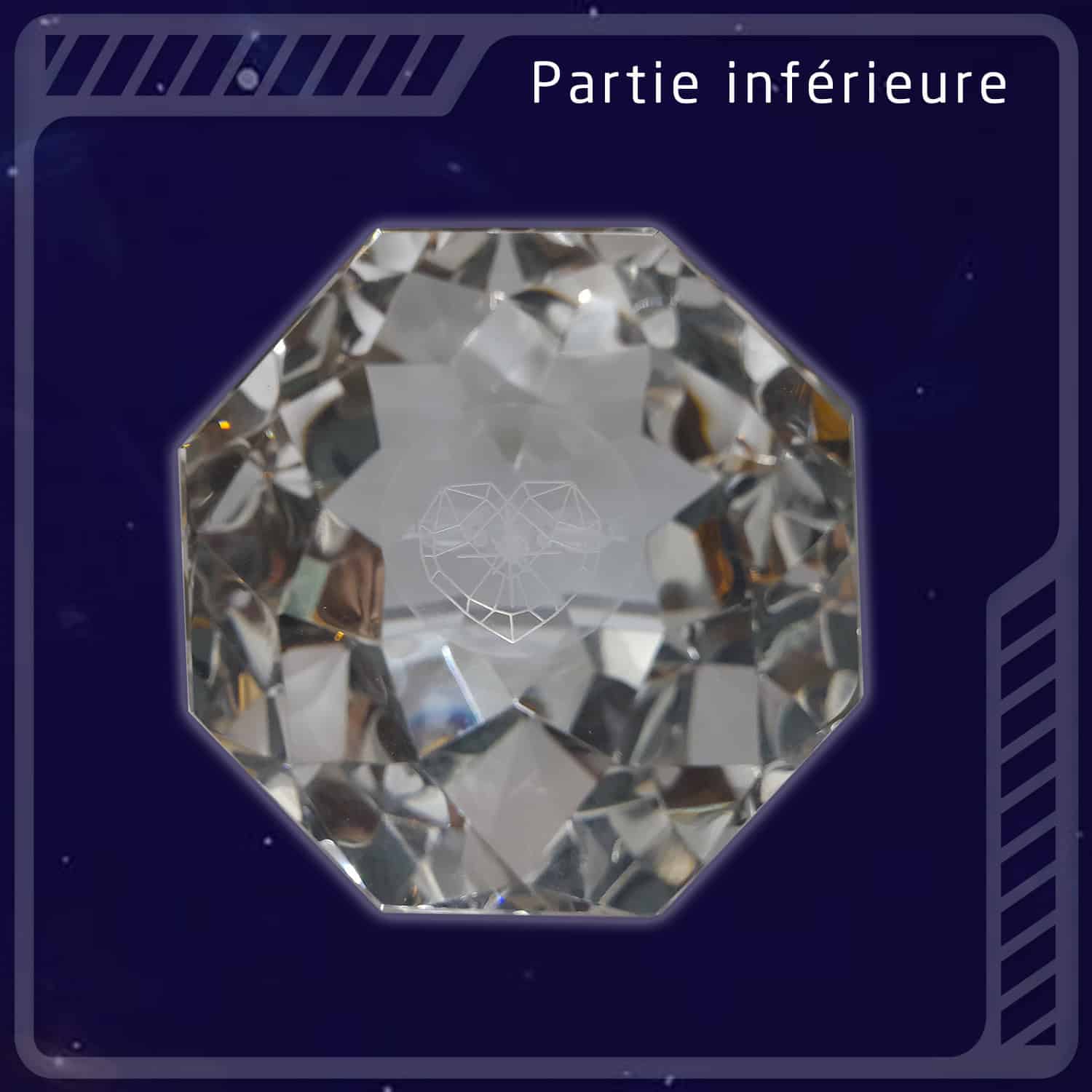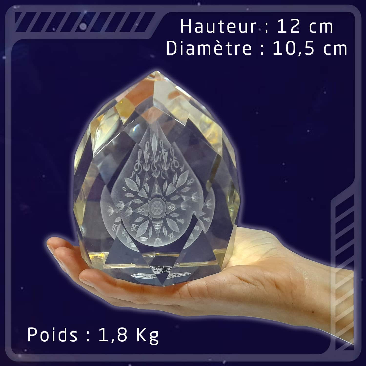 Le symbole a été modélisé en 3D de manière extrêmement précise et respectueuse du code originel selon la science keylontique, puis gravé au laser pour créer le magnifique hologramme au centre du cristal. Le Zome Eckash’YS incarne la pureté vibratoire de la nouvelle Terre dans la densité de conscience Amour-Lumière & Lumière-Amour.