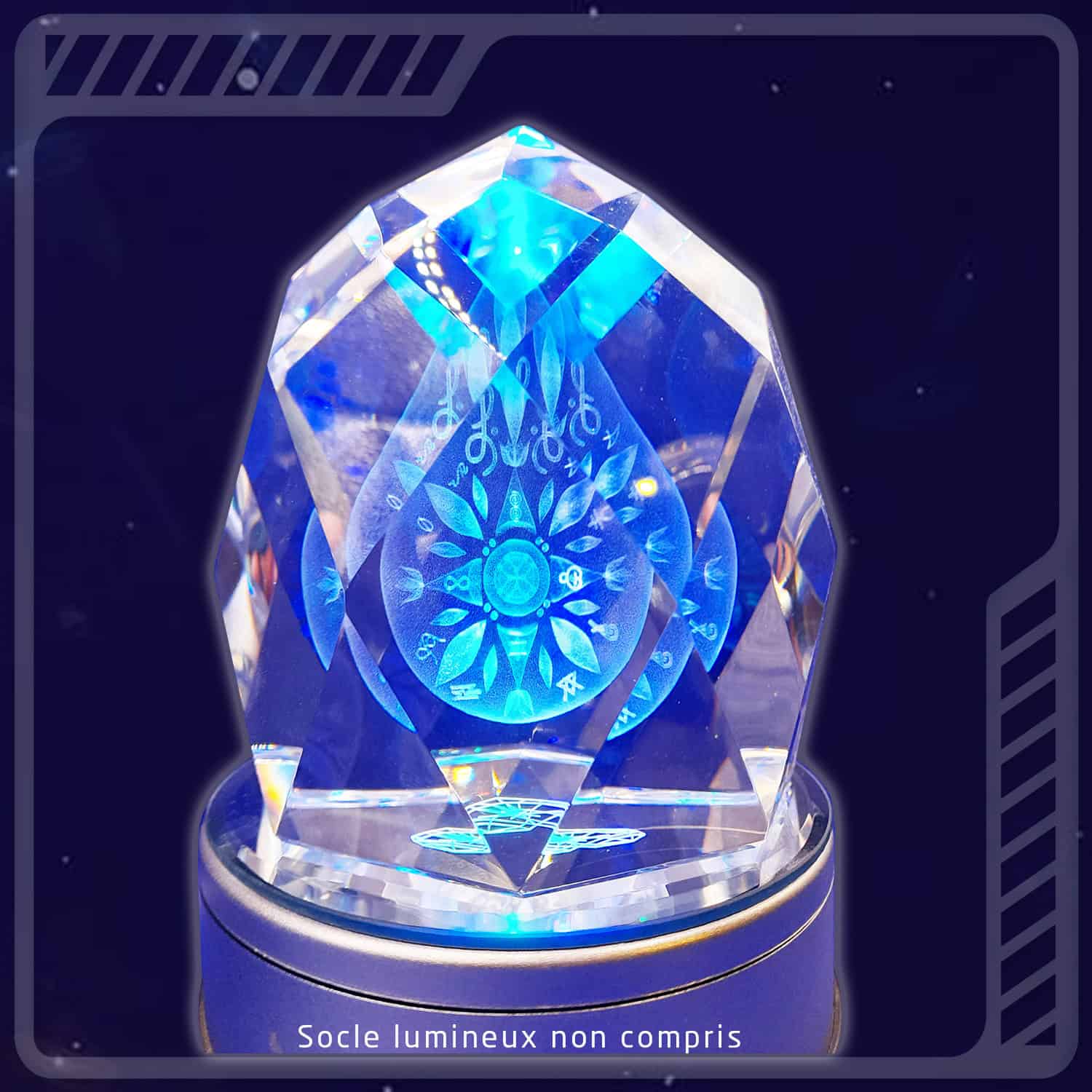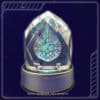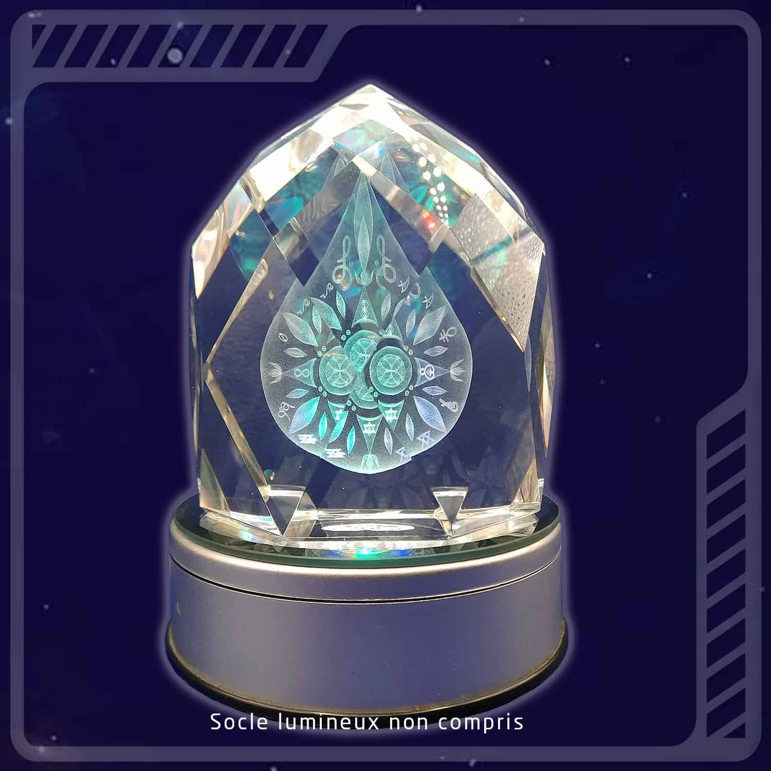 2– Posez le cristal sur un socle lumineux, rotatif ou pas, cela mettra en exergue le symbole et enverra des photons à travers l’hologramme, générant un flux d’information-lumière très bénéfique dans l’environnement.