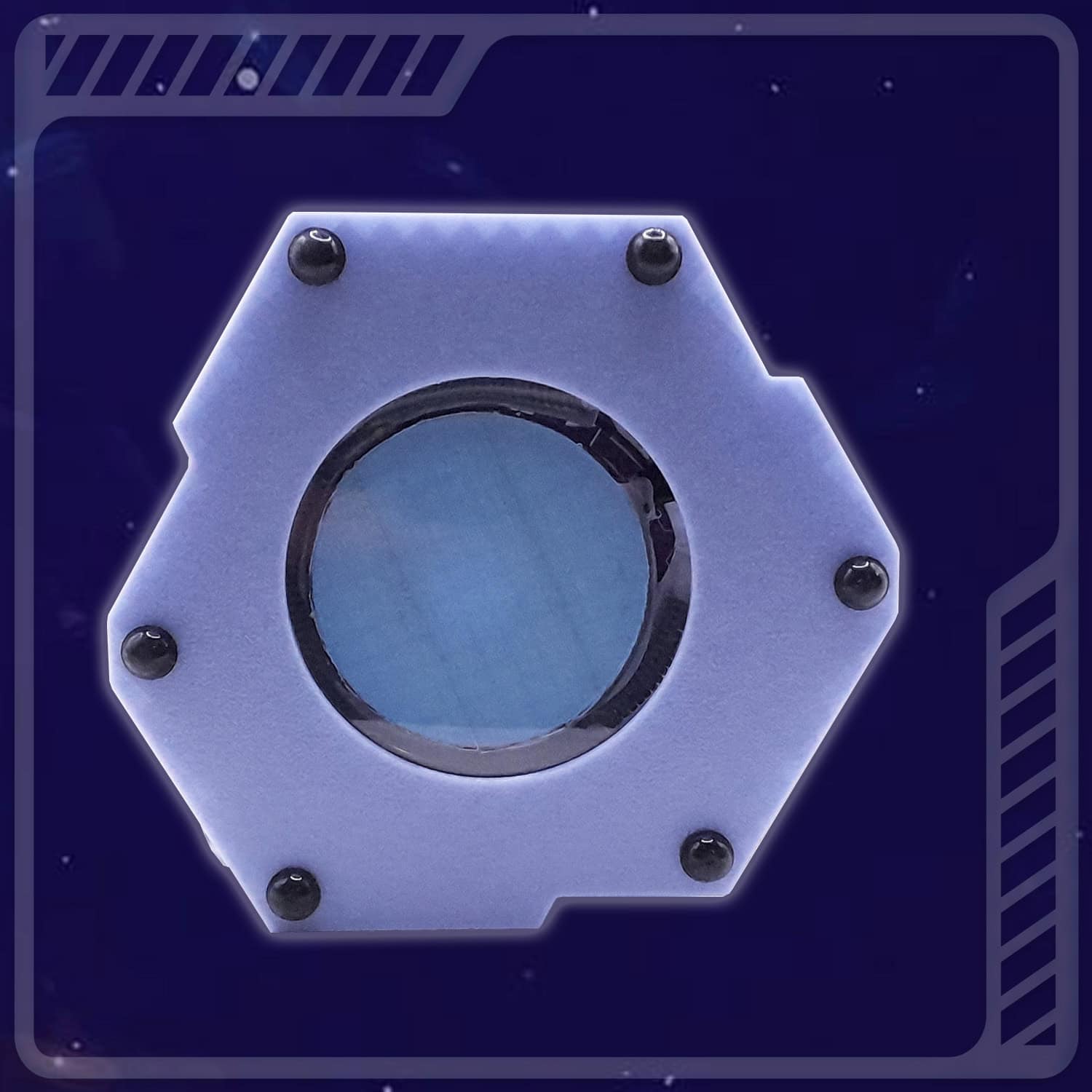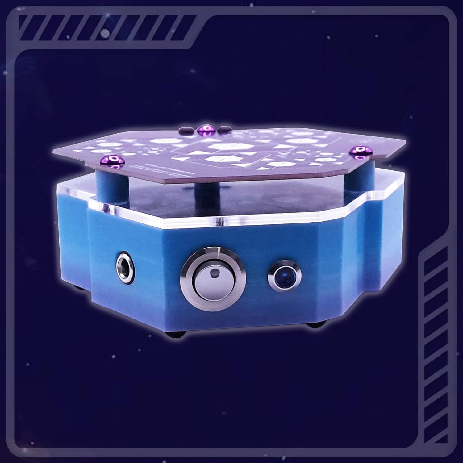 Un fil de cuivre de faible section, intégré dans le tracé gravé, constitue le circuit actif dans lequel est injectée la fréquence fondamentale de 39Hz (voir plus bas les raisons ayant conduit au choix de cette fréquence). Lorsque le signal traverse cette structure géométrique, il induit une polarisation dynamique du champ électromagnétique local, générant une émission scalaire à faible amplitude mais à haute cohérence spatiale. Même lorsqu’il est éteint, l’Aural’YS est actif en raison de l’onde de forme, c’est-à -dire du passage de champ électromagnétique naturel dans ce circuit décagonal.