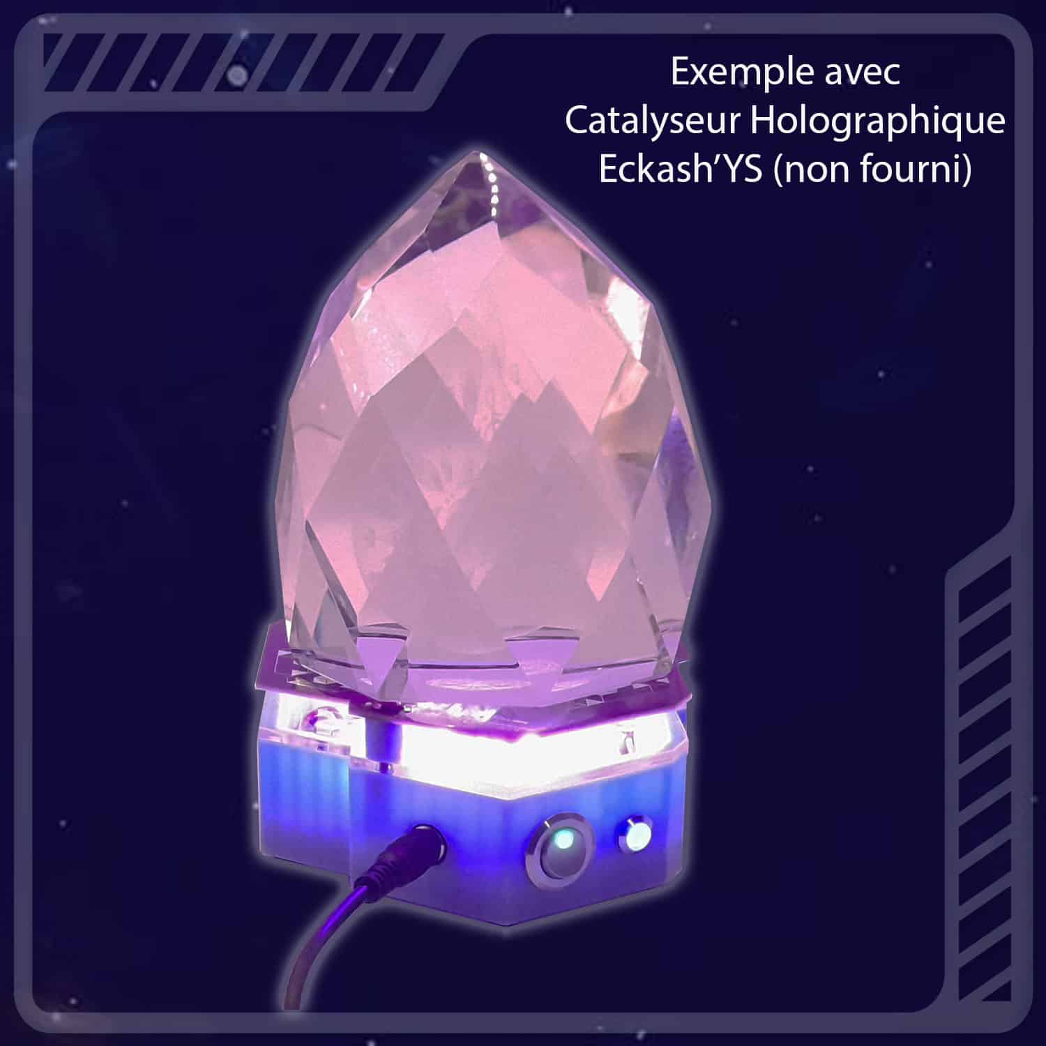Embase lumino‑plasmo‑scalaire diffusant en continu une lumière douce et un champ vibratoire harmonisant, grâce à la combinaison d’ondes scalaires et de nanoparticules de Plasma, alimentées par un micro-générateur de fréquence pré-programmée à 39Hz.