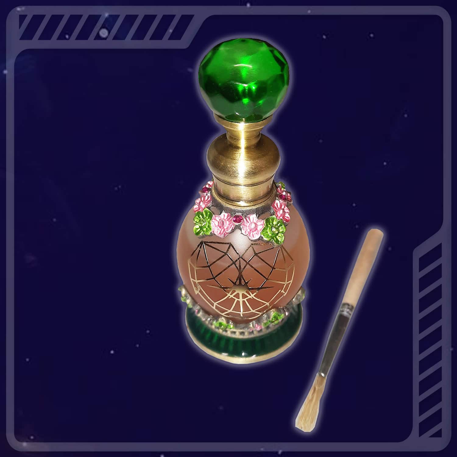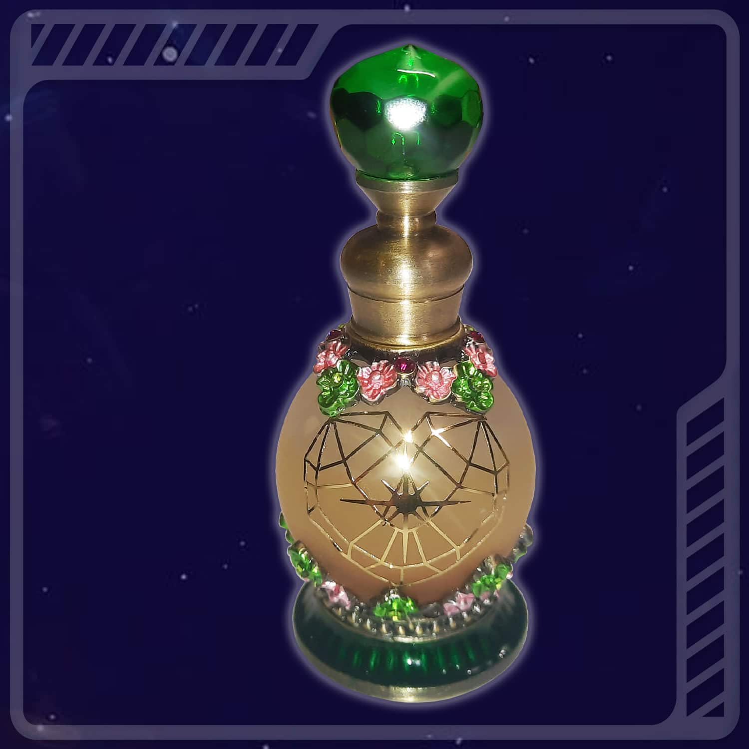 Sa base est une huile essentielle de rose 100 % naturelle à laquelle il a été ajoutée une fine poudre d’un puissant mélange de 4 variétés de pétales de roses séchées (2 roses blanches et 2 roses rouges). 4 GaNS (Gaz à l’état Nano Solide issue de la Science du Plasma) produits par nos soins, lui sont associés : 3 GaNS Matriciels (Magnésium/Zinc/Cuivre/Fer) et un GaNS d’or. Pour finir, quelques gouttes d’huile de la ‘‘teinture-mère’’ consacrée le 21 décembre 2024 dans la forêt de Saint-Maximin-La-Sainte-Baume (Var – 83), sont ajoutées pour parachever cette huile d‘onction sacrée et alchimique.
