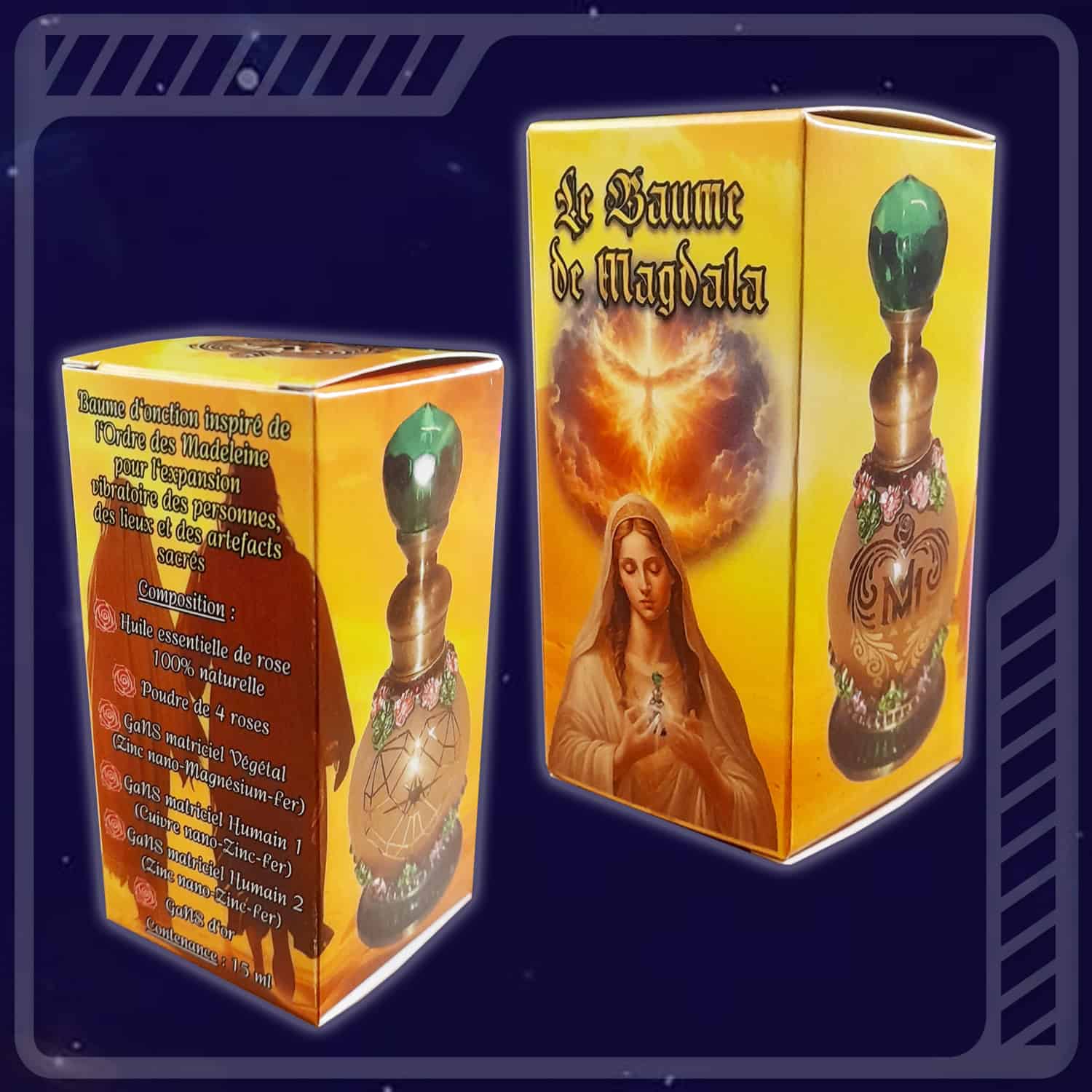 Ce Baume est dédié à l’établissement du Féminin Sacré dans la nouvelle vibration Amour-Lumière de Gaïa, à travers la figure archétypale de Myriam de Magdala. Quelques recommandations et exemples d’utilisation sont proposés plus loin, mais libre à vous de faire œuvre de créativité et d’étendre à votre gré le champ d’application.