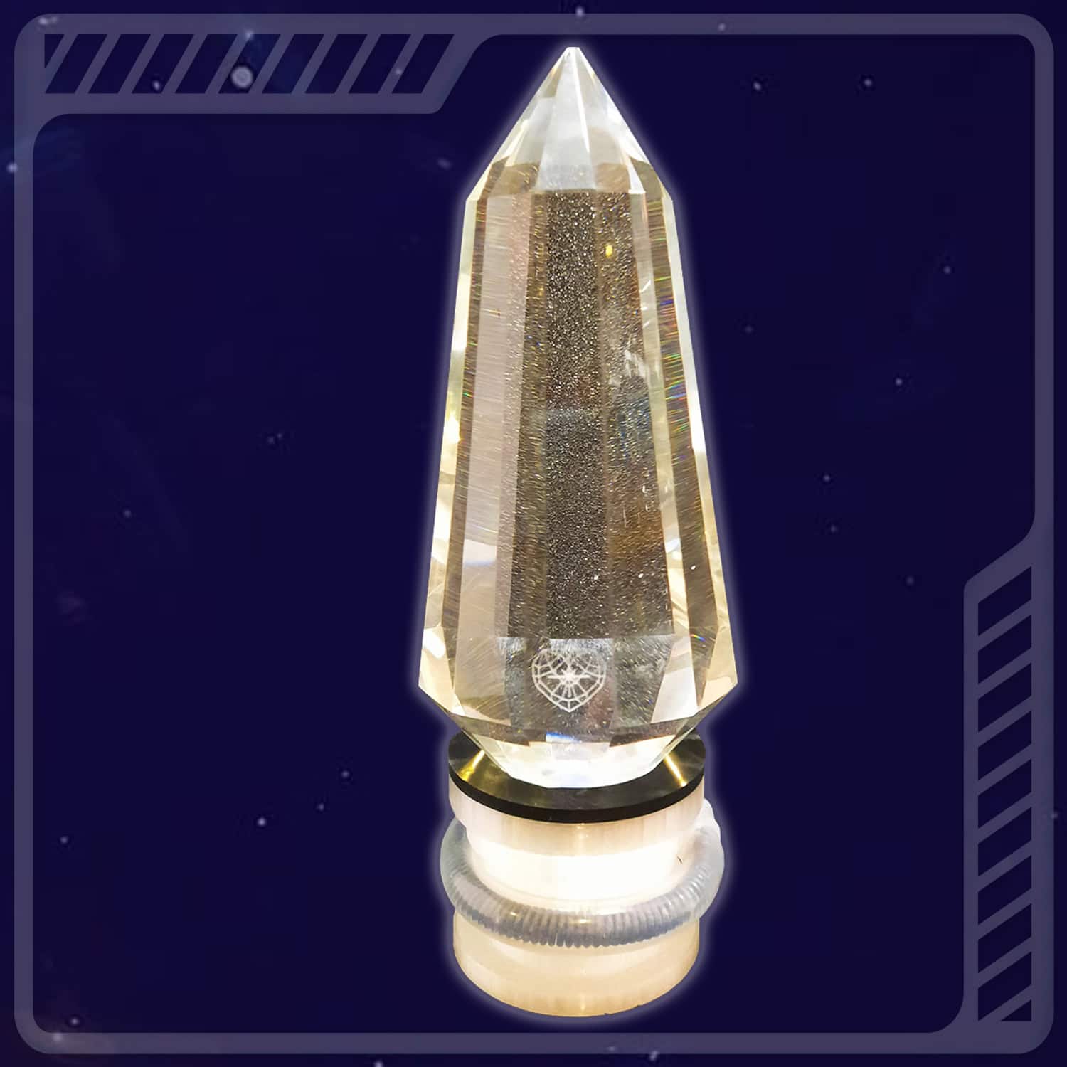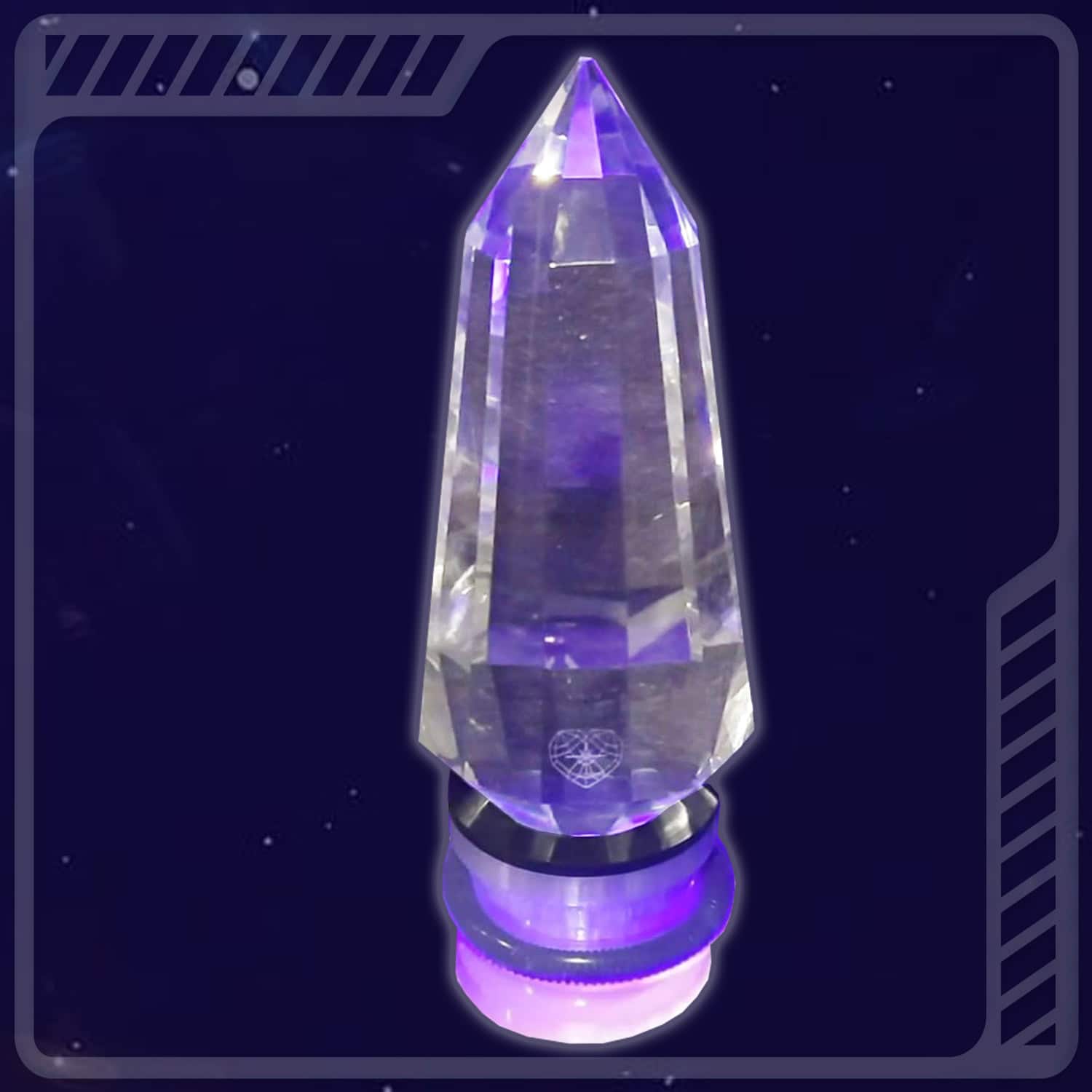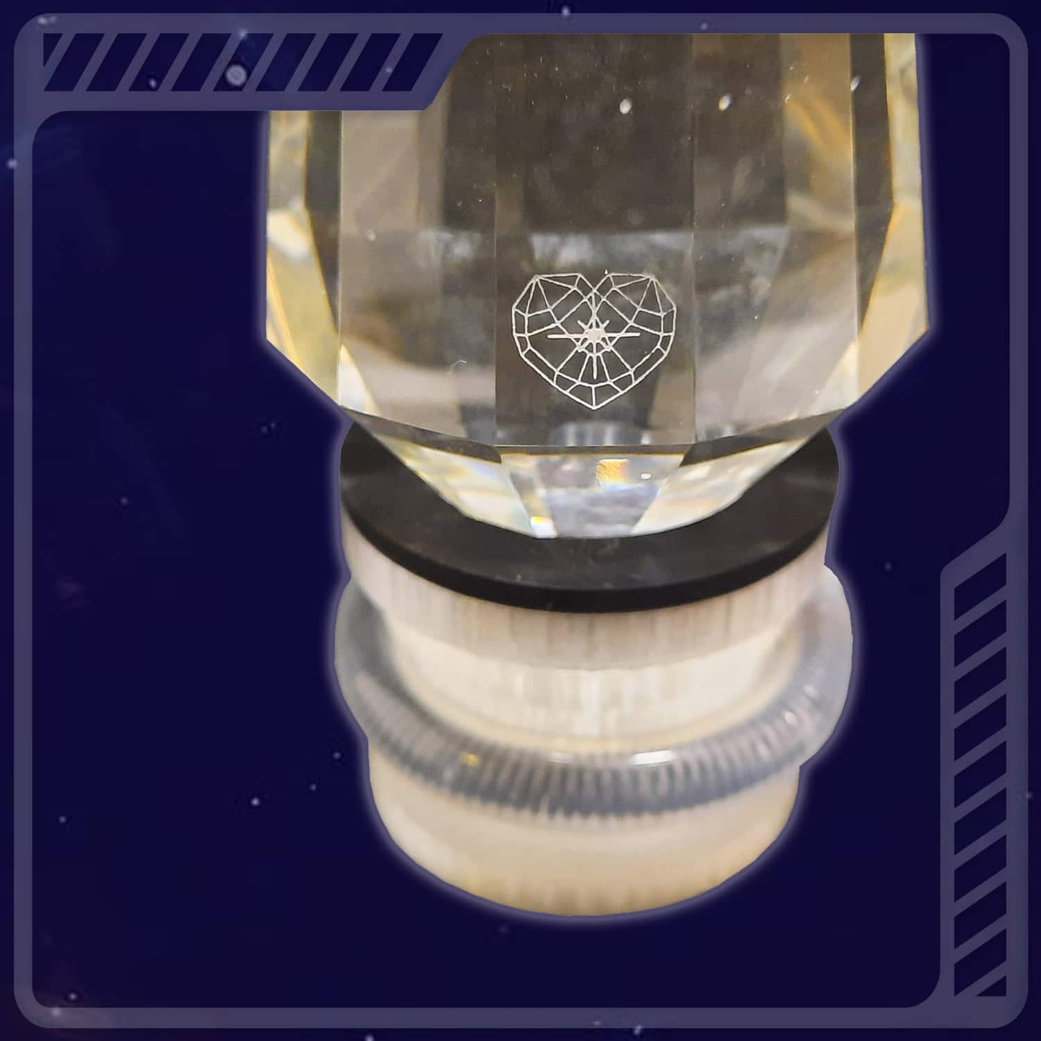 Un discret “Cœur Cosmique“ de 15×12 mm est gravé sur la base d‘une des facettes permettant à ce cristal de ne pas être détourné de sa mission initiale d‘élévation de la Conscience humaine et planétaire dans le service à Autrui (Loi Une).