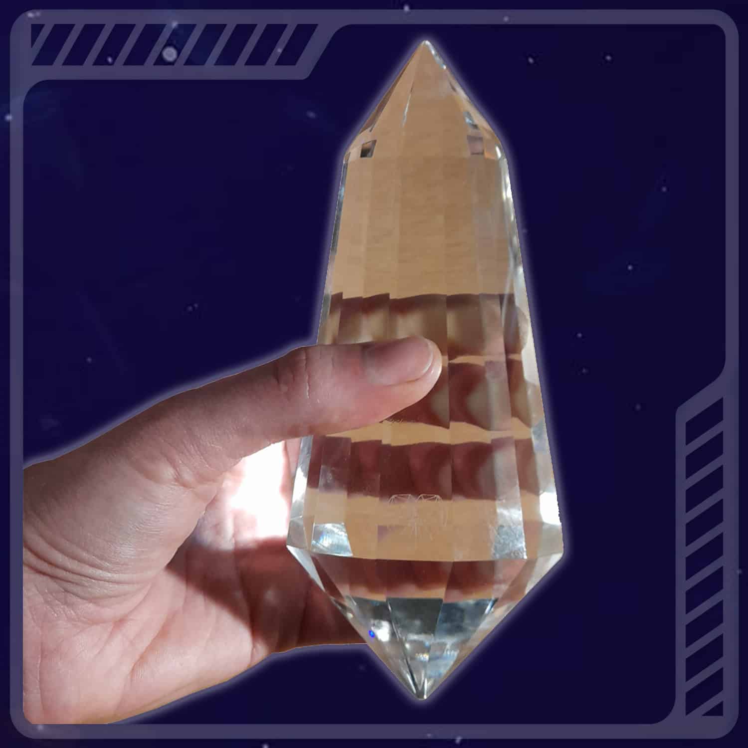 Le Cristal Phi Erra est un cristal taillé de façon très précise avec 12 facettes et biterminé (avec deux pointes). C‘est un véritable cristal et non pas du verre car il ne contient pas d‘oxyde de plomb. Ce n‘est pas du Quartz improprement appelé “Cristal de Roche“ qui lui est comme le cristal constitué de dioxyde de Silicium, mais bien souvent n‘est pas translucide car composé de divers él2ments métalliques formant des inclusions et des teintes gris laiteux.