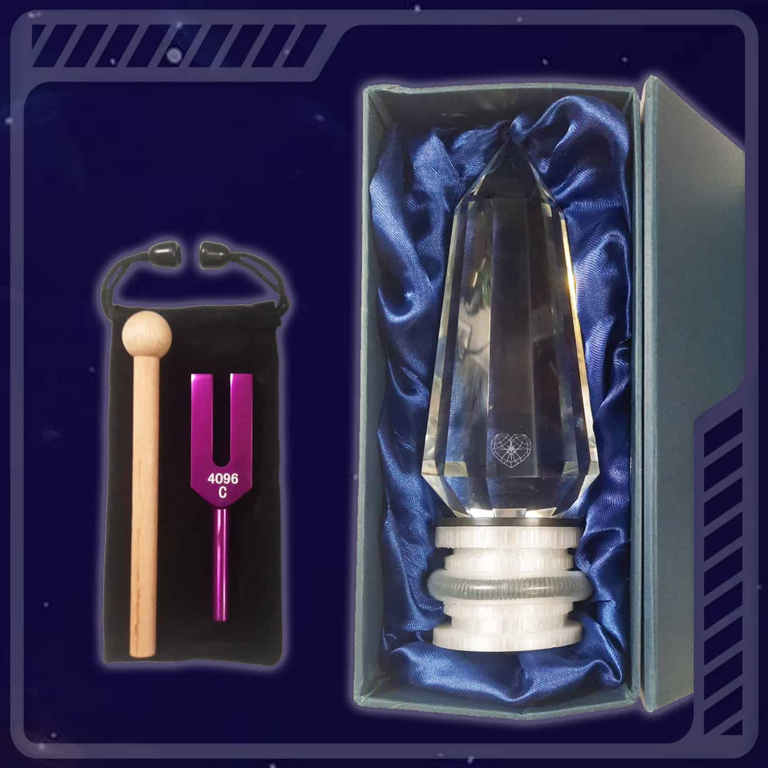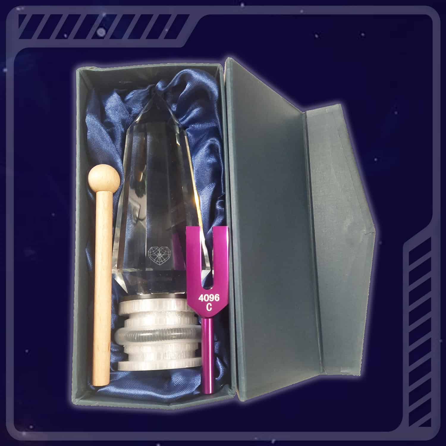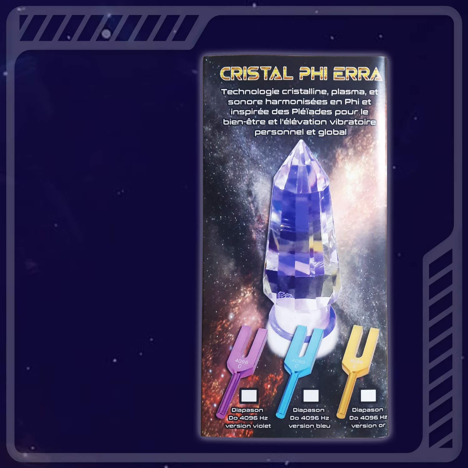 Le Cristal Phi Erra est accompagné d‘un diapason décliné en 3 couleurs possibles (Bleu, Or ,Violet) résonnant en Do à la fréquence 4096 Hz. Cette fréquence appartenant à la Gamme de Pythagore ou “Gamme Naturelle“ amplifie harmonieusement la puissance du cristal. 4096 Hz est une suite logique Pythagoricienne en octave de 8 (32 – 64 – 128 – 256 – 512 – 1024 – 2048 – 4096 Hz).