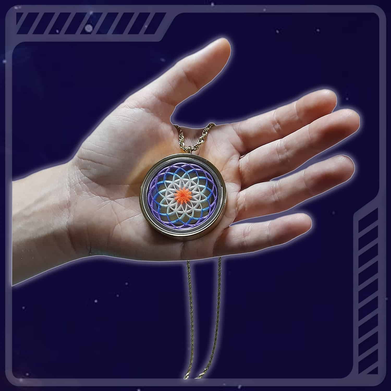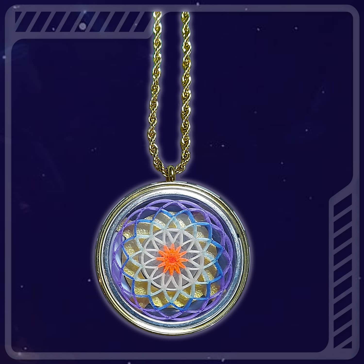 Dans ce pendentif élégant et vibratoire, le premier élément constitutif est une Fleur de vie “Lotus de Cristal” (voir plus bas la géométrie sacrée qui caractérise ce symbole) imprimée en multicolore avec une imprimante 3D professionnelle. Celle-ci est placée autour du deuxième élément constitué par un puissant aimant Néodyme en forme d’anneau de 40 mm de diamètre.