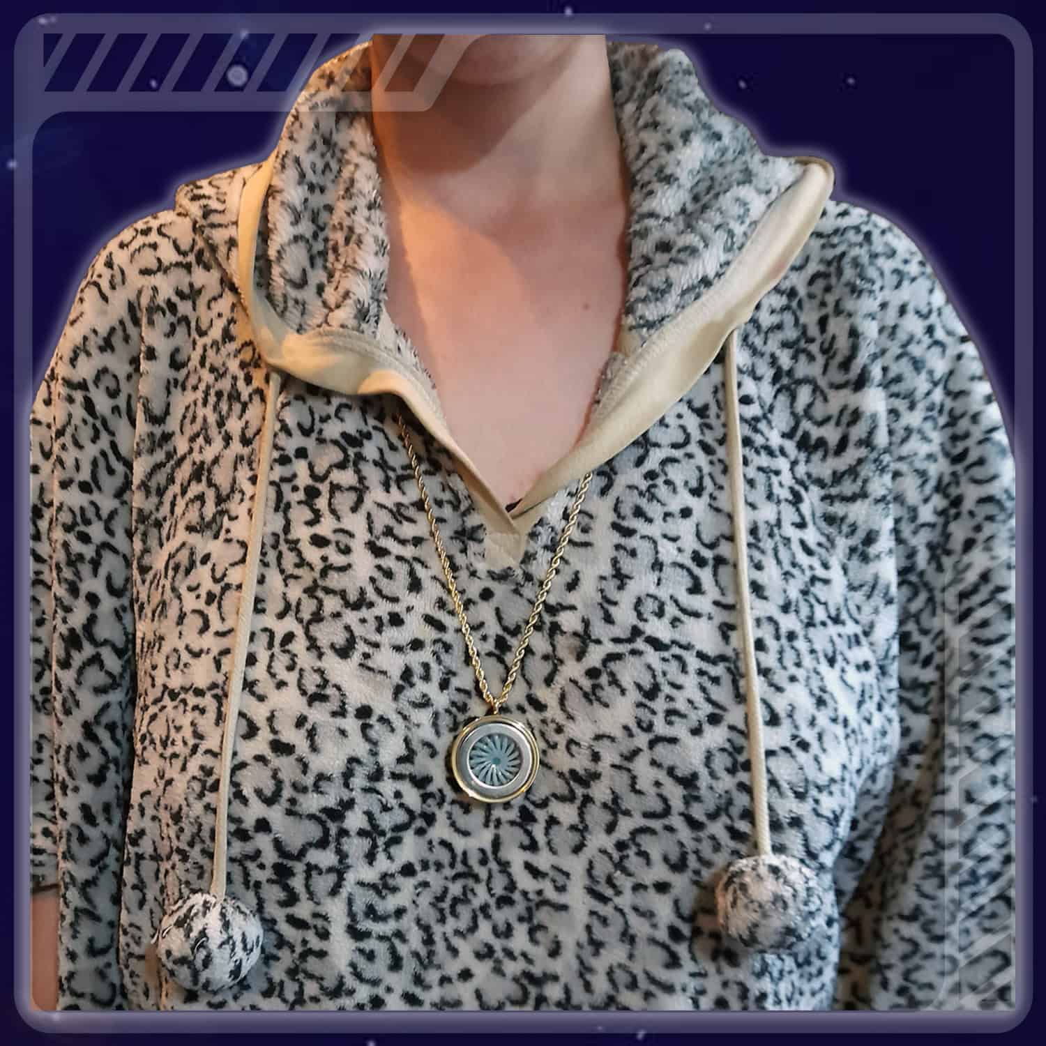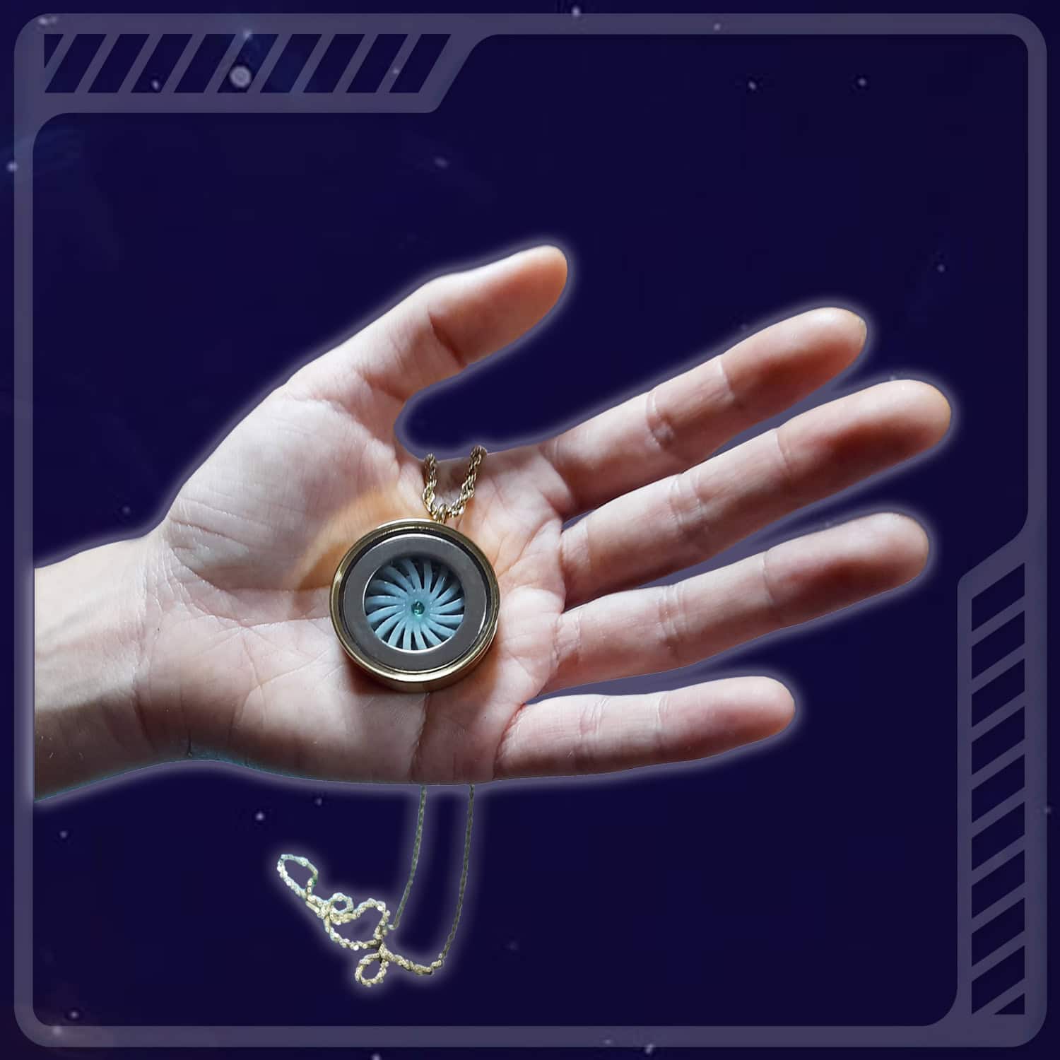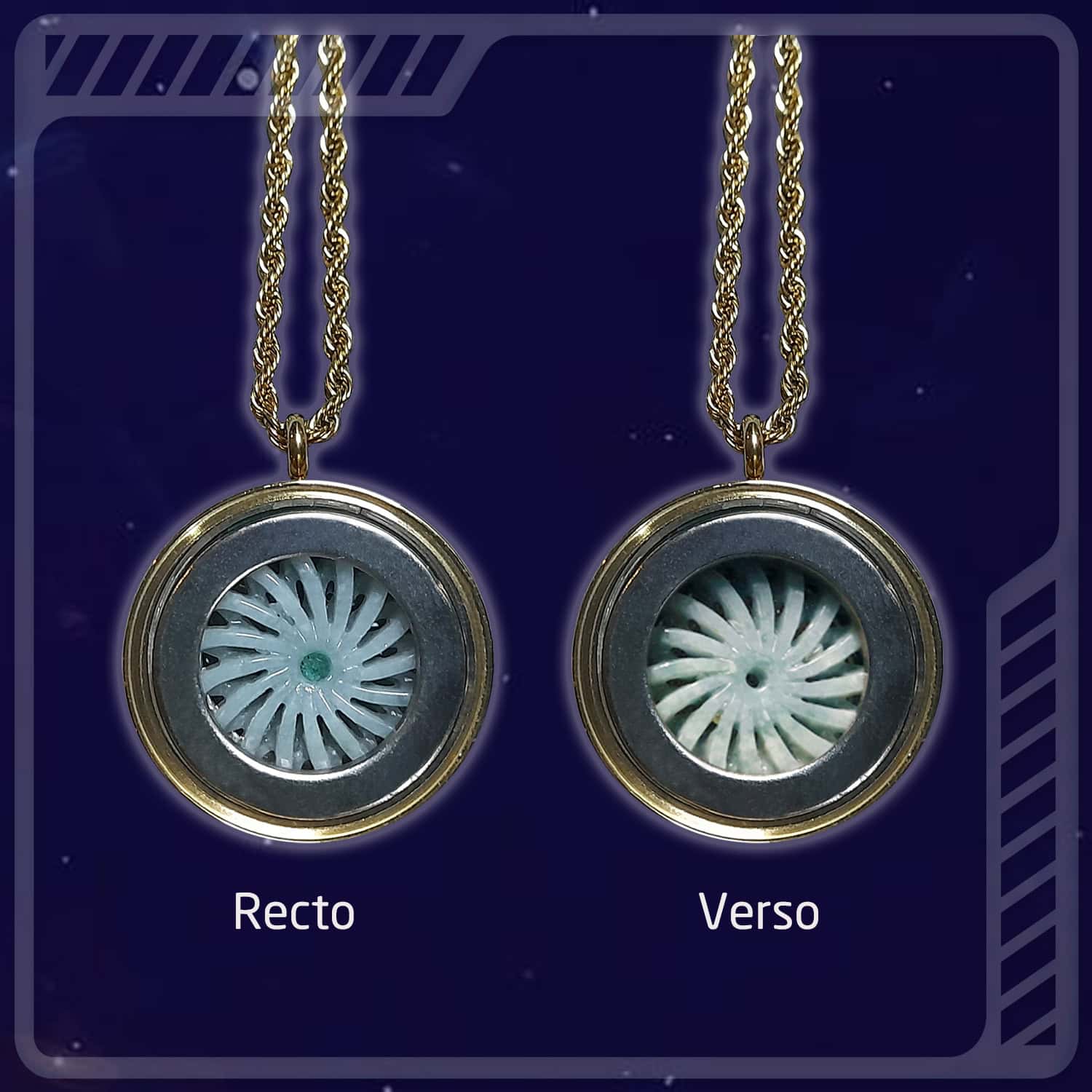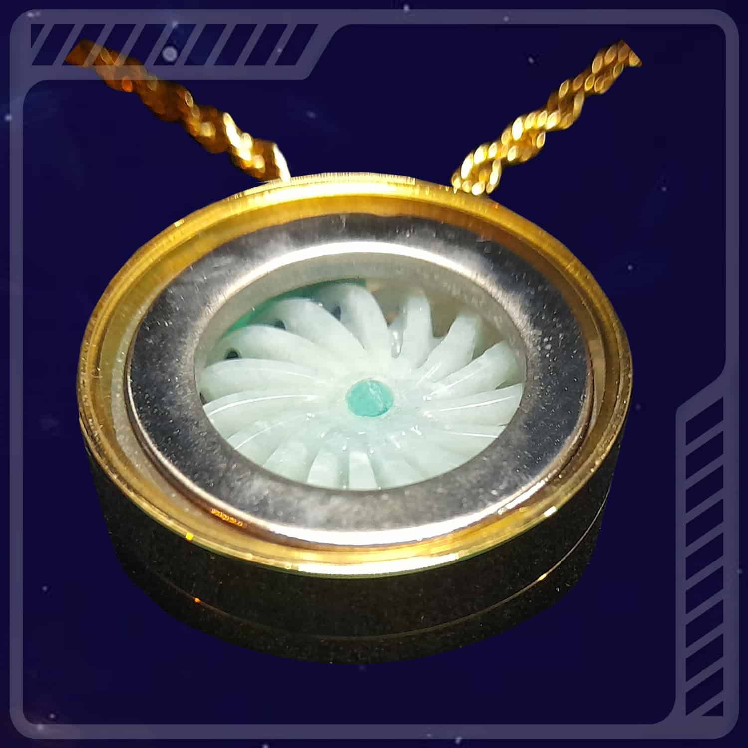 Un anneau de GaNS est soumis à pression magnétique par deux aimants compressés avec des polarités SUD-SUD, afin d’activer les nanoparticules qui composent le liquide plasmatique (Dioxyde de Carbone – CO2 – et Oxyde de Zinc – ZnO) qu’il contient. Cette diffusion magnéto-gravitationnelle se diffuse vers l’extérieur vers l’avant et l’arrière du pendentif.