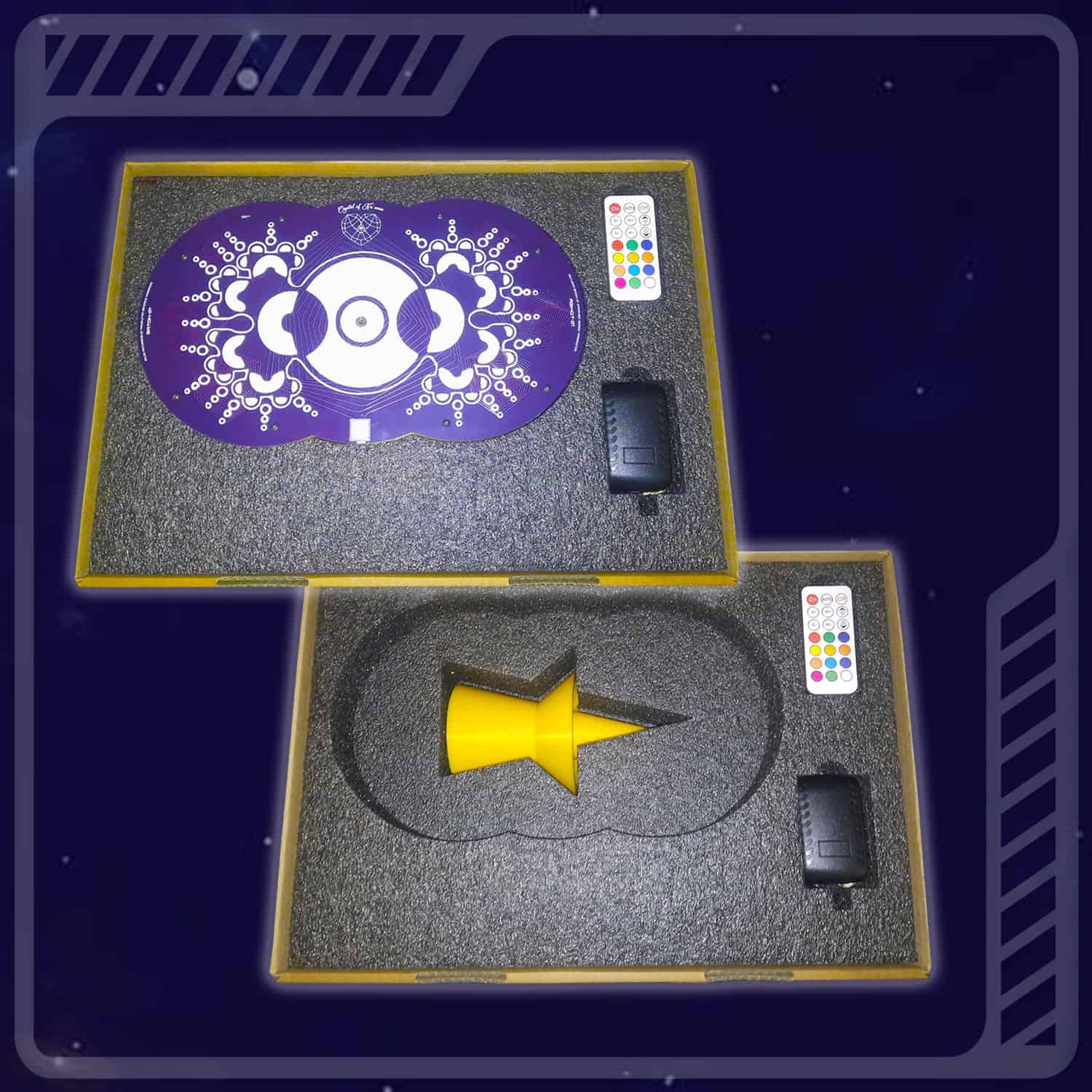 Transfo, câble jack audio et télécommande pour le réglage des animations LEDs RGB de la technologie fournis avec le dépliant explicatif, dans une boite protégée avec de la mousse.
