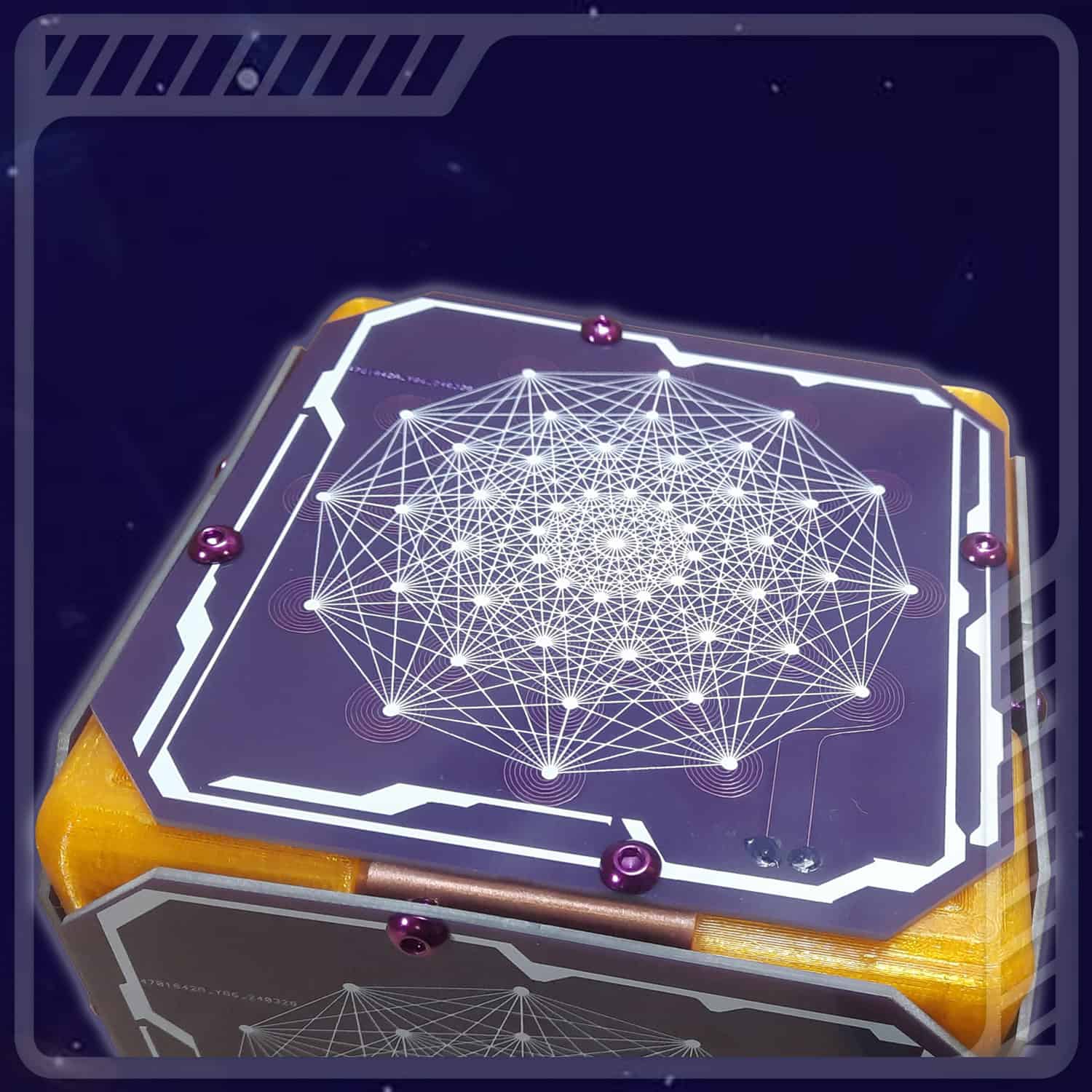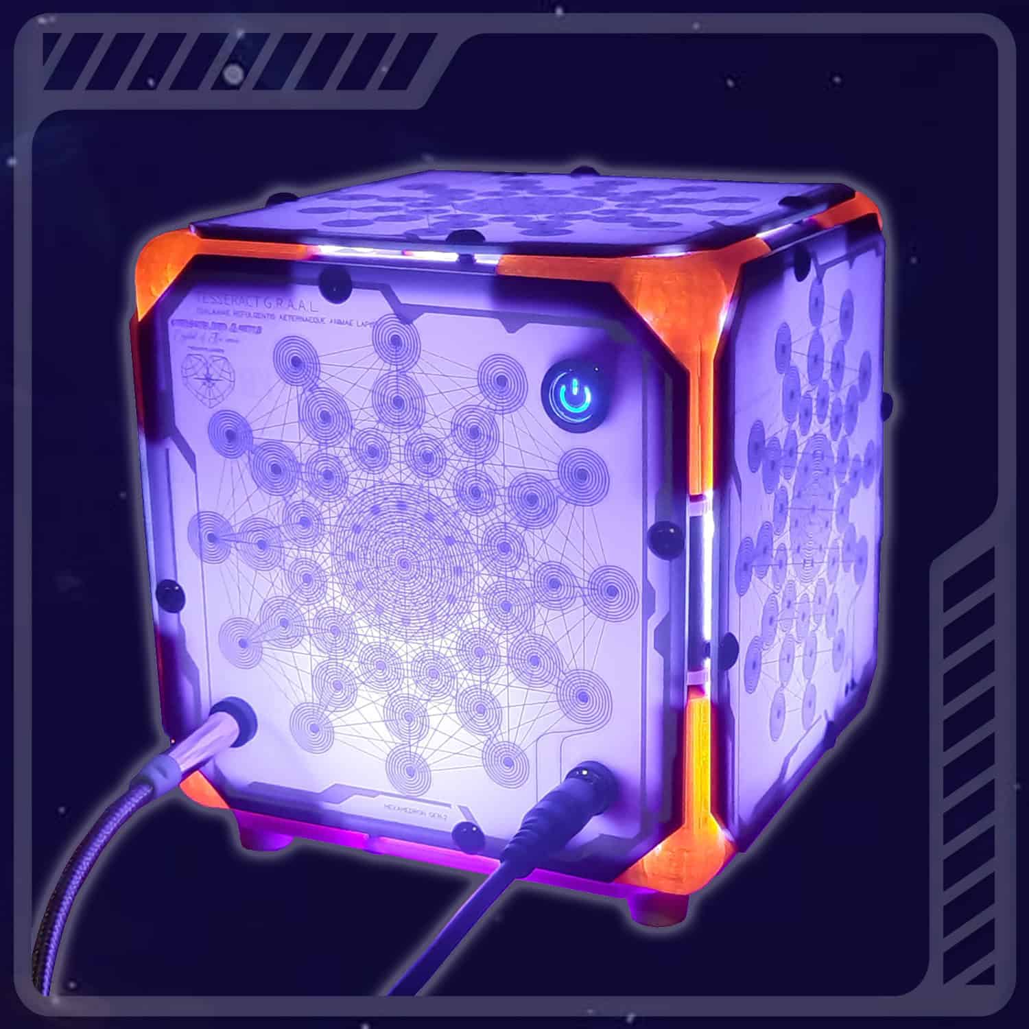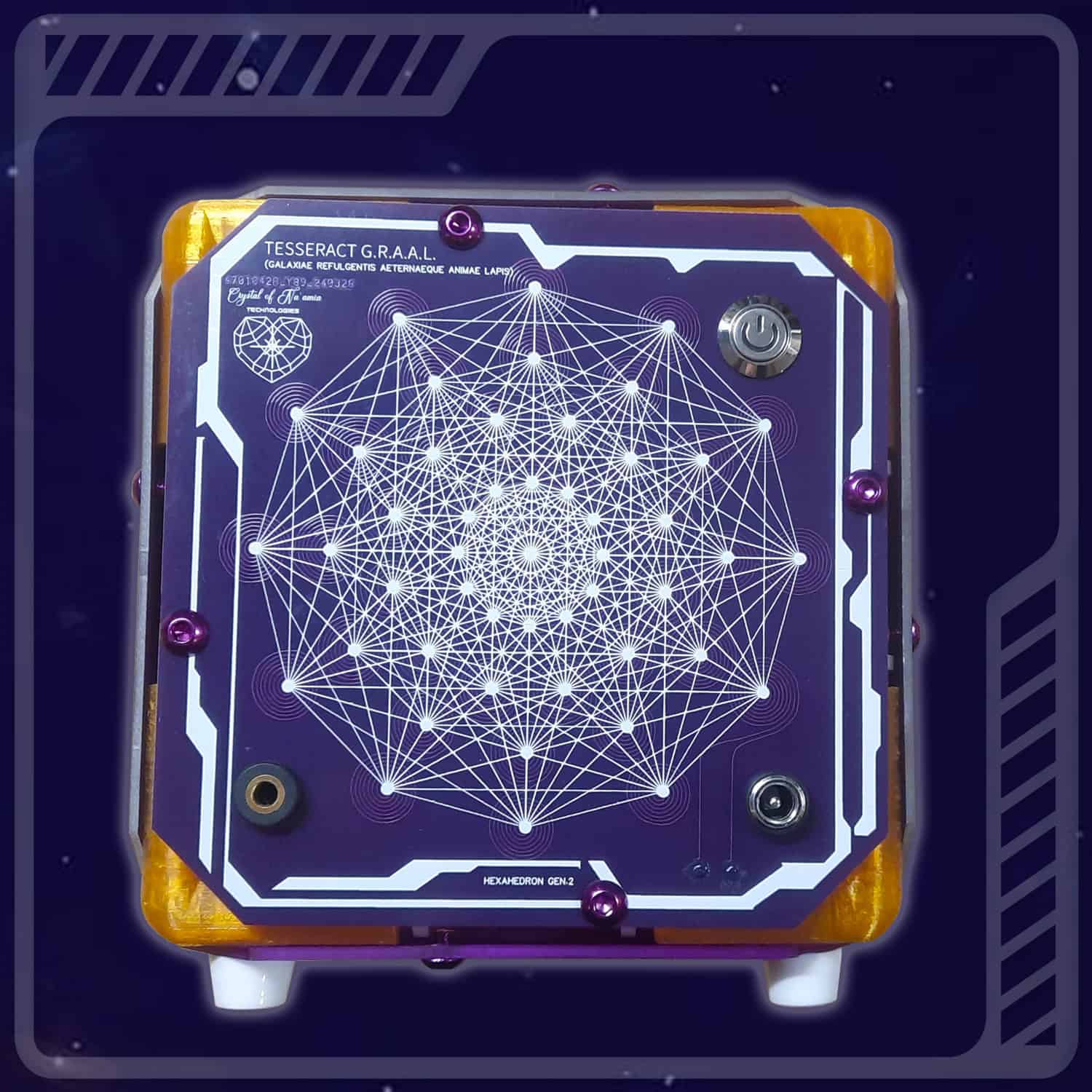 La structure du Tesseract est constituée de tubes de cuivre avec des connecteurs bio-plastiques. Les plaques scalaires sont proposées en trois couleurs différentes en lien avec les chakras supérieurs (Bleu indigo ; 3ème oeil – Pourpre : Coronal – Blanc : chakra 8 et +). La sérigraphie représente un Hexeract, un hypercube de 6D.