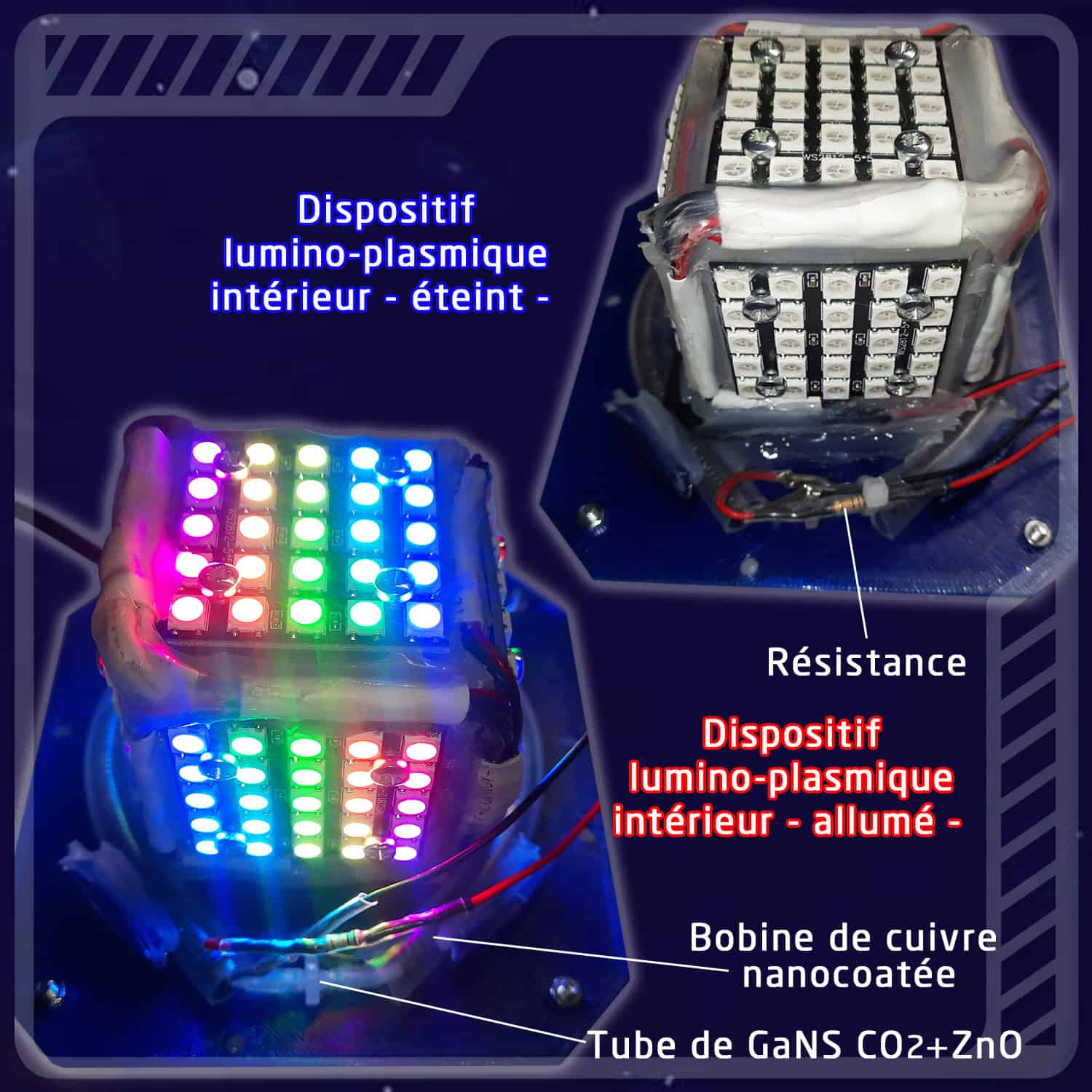 Le deuxième, interne, est un petit cube lumino-plasmique composé de 5 plaques de 25 LEDs, soit au total 125 LEDs, entourées par une bobine de cuivre nanocoatée contenant un tube de Gaz à l‘état nano-solide (GaNS) mélange de CO2 et ZnO.