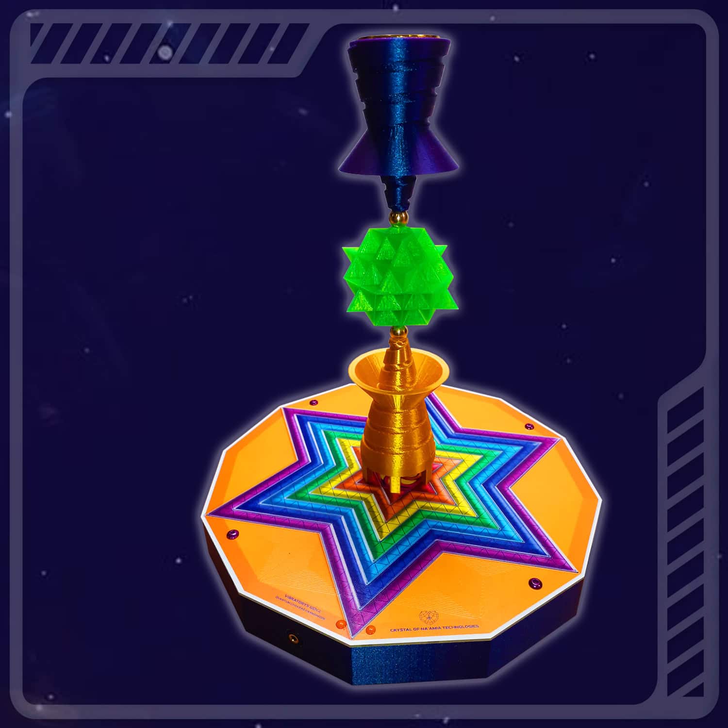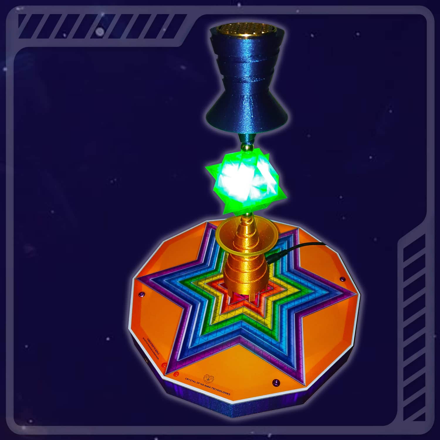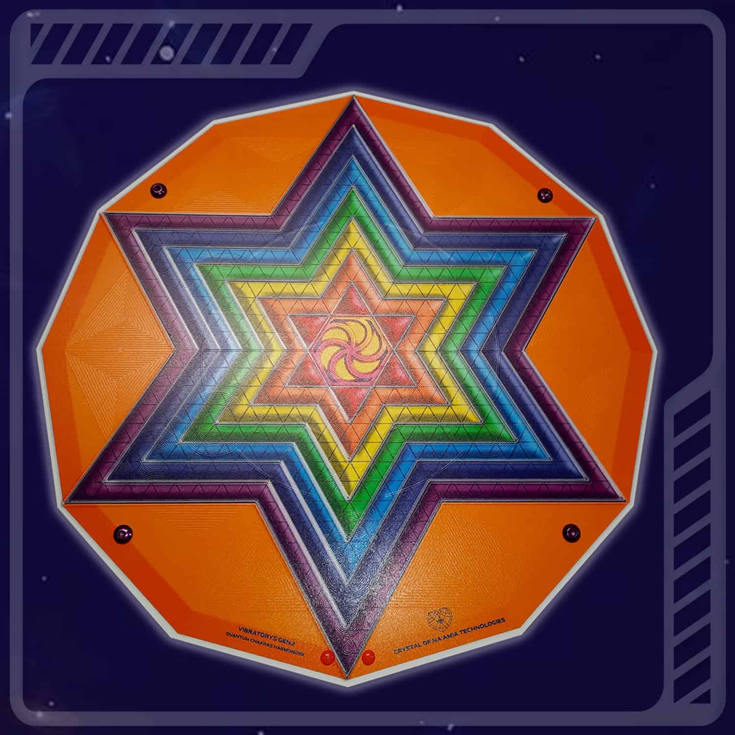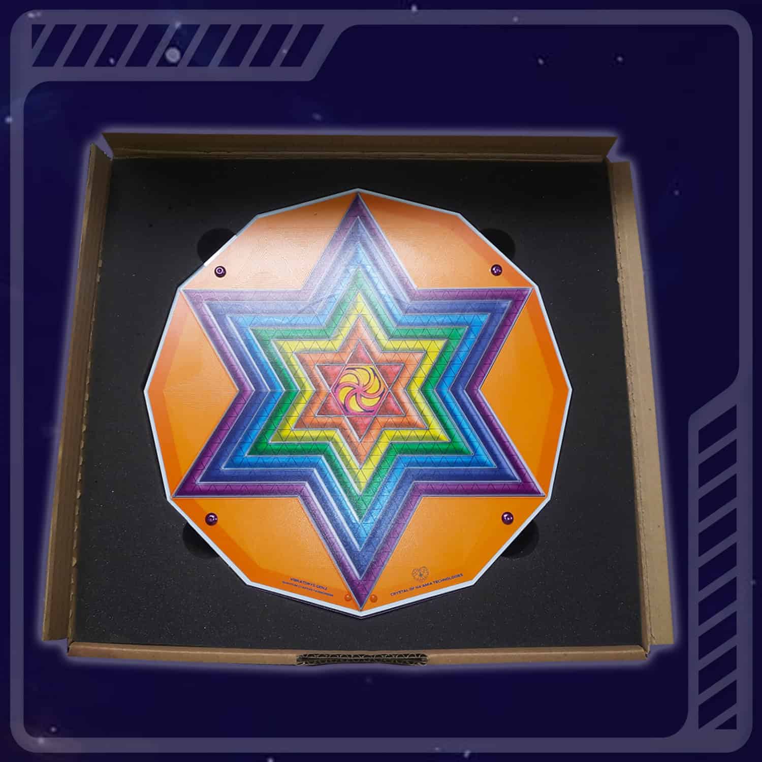 Cette combinaison débute avec la science des ondes de formes ou Radionique, qui utilise la ‘‘divine proportion’’ incarnée par le nombre d’or (Phi) et la suite de Fibonacci. Elle se poursuit par l’utilisation de la Lumière qui va à travers le mouvement des photons des LEDs au centre de l’antenne et sous la plaque, stimuler le vortex scalaire. Elle continue ensuite avec des couleurs qui au niveau de l’étoile à 6 branches en sérigraphie colorée de la plaque, sont agencées pour influencer la vibration globale. Puis les bobines de Plasma contenant des nanoparticules de Gaz à l’état Nano Solide, vont élargir l’amplitude du champ vibratoire. Celles-ci sont renforcées par la 5ème combinaison qu’est la plaque de circuit scalaire, qui elle permet la diffusion du champ de torsion principal et une fréquence particulière à travers son schéma conducteur, lui-même répondant à une géométrie sacrée issue d’un Crop Circle (ou Agroglyphe).