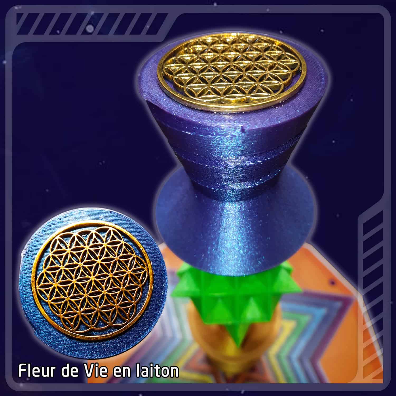 Le Dy, véritable concentré de science initiatique et de géométrie sacrée issue de l’Egypte antique, a été présenté en détail sur le site de Crystal of Na’amia dans l’onglet ‘‘Catalyseurs holographiques’’ et la page ‘‘Antenne Dy Supraluminique’’. Dans cette version nous y avons inclus la gravure d’une spirale d’or (ou Spirale de Fibonacci) tournant pour le Dy inférieur doré, dans le sens antihoraire et magnétique, pour optimiser sa fonction de diffusion à 360° des énergies terrestres transmutées, et tournant pour le Dy supérieur violet, dans le sens horaire et gravitationnel pour la diffusion des énergies célestes amplifiées.
