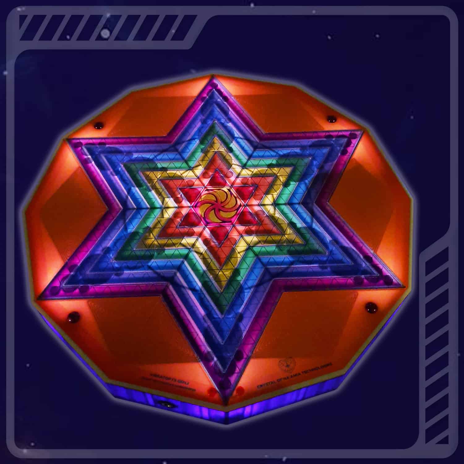 Un interrupteur illuminé incorporé dans le support ainsi qu’une télécommande, permettent de piloter les 6 bandes LEDs calquées sur l’étoile, offrant ainsi des animations lumineuses soutenant les ondes scalaires de la plaque.