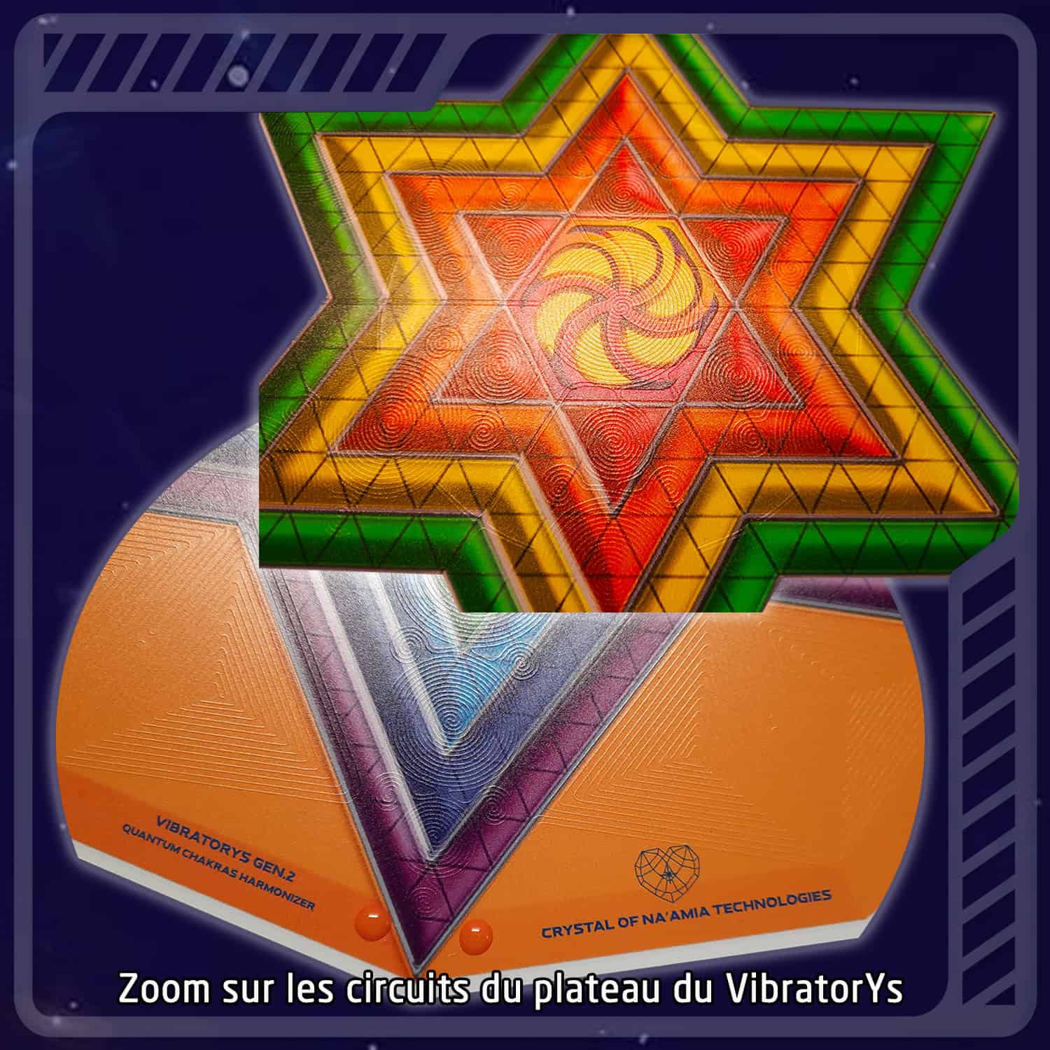 Le Vibrator’Ys possède une plaque avec un circuit électrique permettant d’injecter une fréquence via un générateur (lecteur MP3, smartphone avec appli ou générateur dédié) et de générer un puissant champ de torsion scalaire.