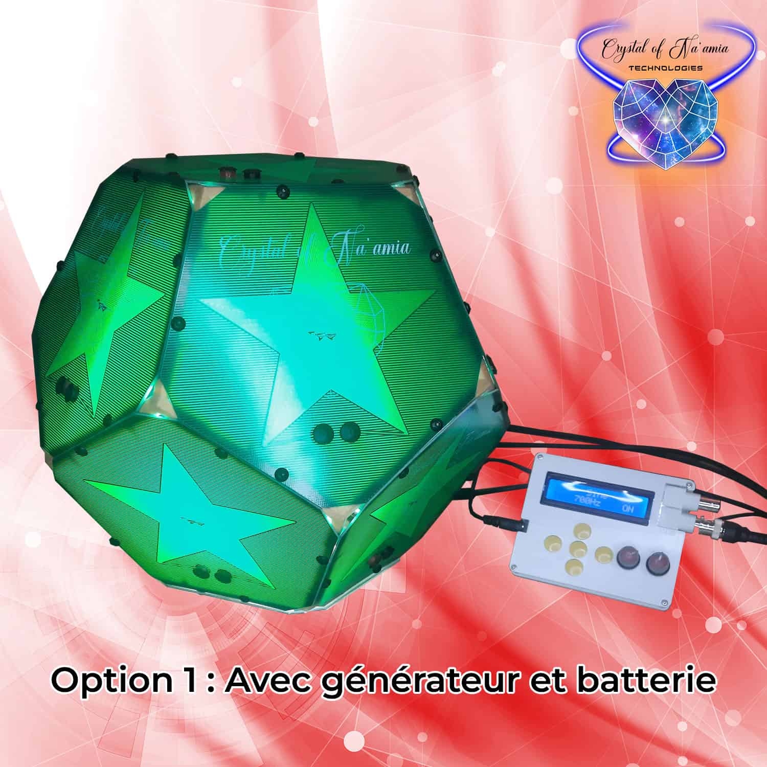 OPTIONS : La technologie de base est fournie avec un transfo, un câble BNC vers jack audio et une télécommande pour le réglage des animations LEDs RGB (possibilité d’utiliser son propre smartphone ou lecteur mp3 pour l’injection de fréquences).
