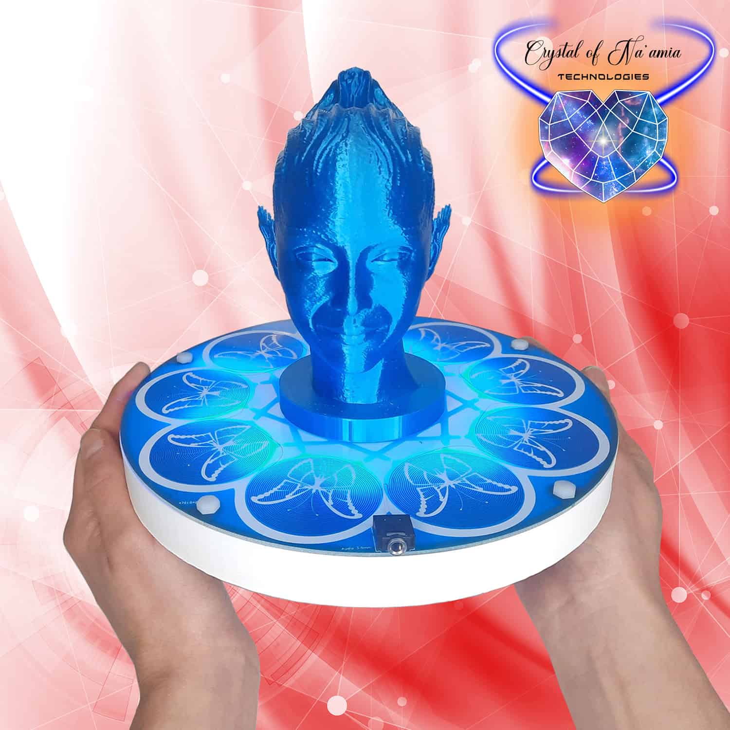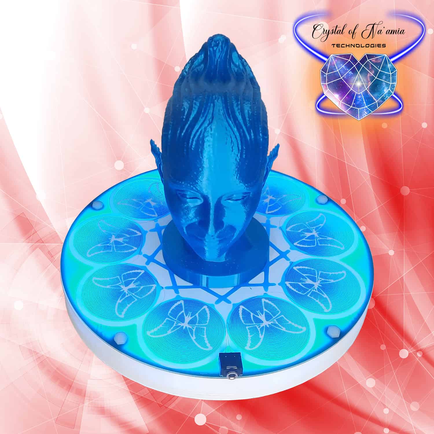 La tête bleue imprimée en 3D, fixable au centre du plateau à travers un aimant intégré, représente le visage de EVEA-YS, une stellaire provenant de l’étoile Sirius C (Constellation du Grand Chien)