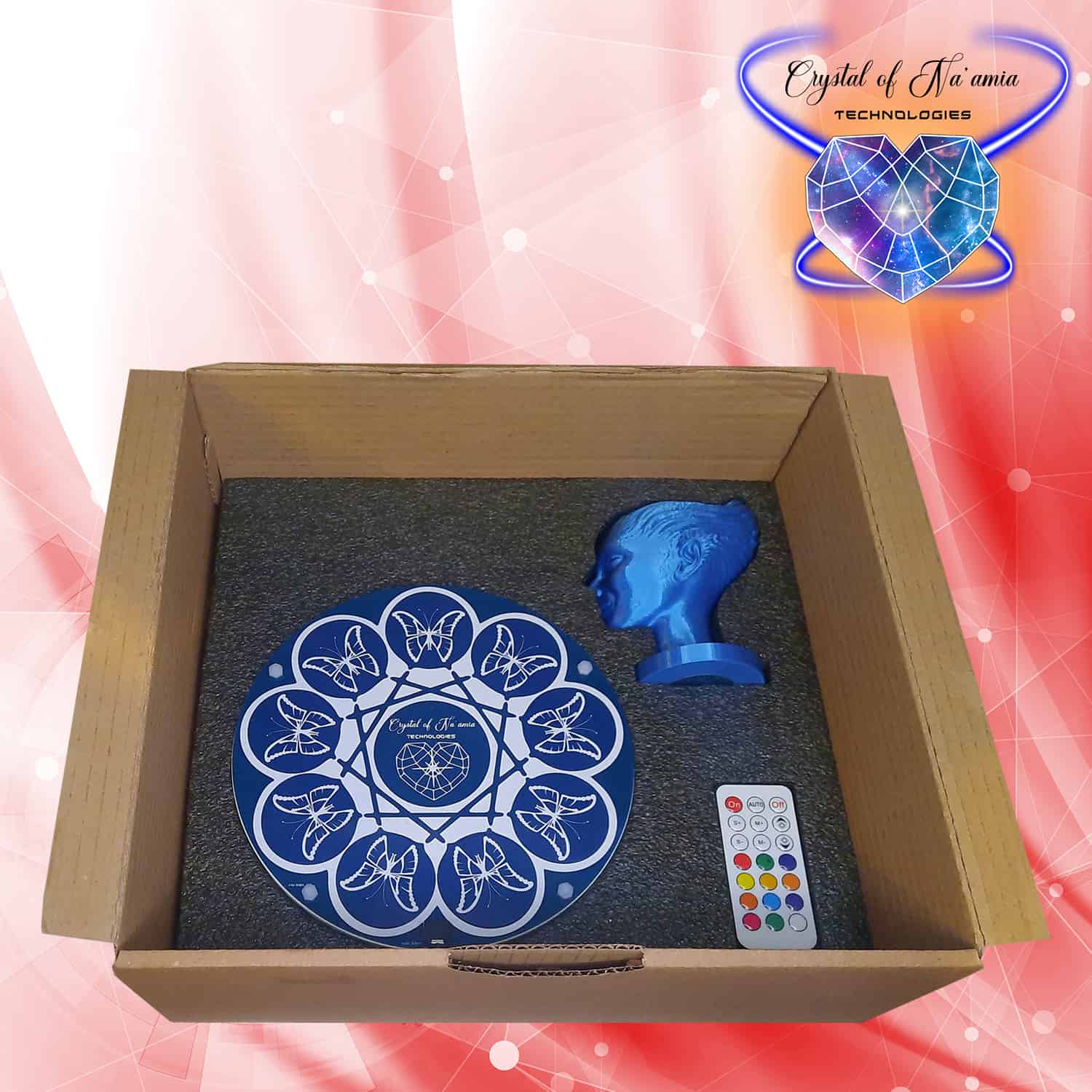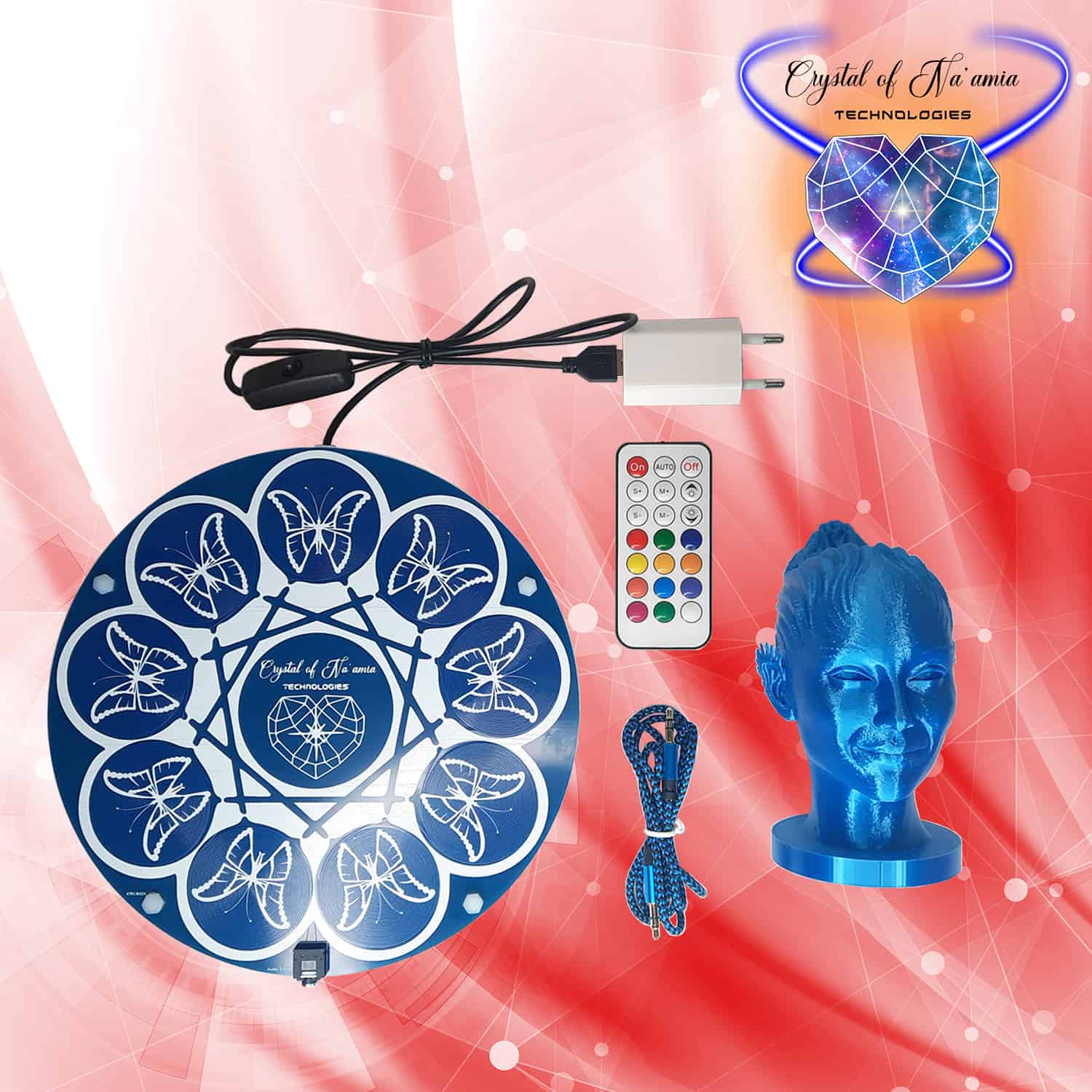 Pour renforcer cette production de champ scalaire vortexiel, nous avons doté cette technologie de 9 anneaux de leds réglables par télécommande, positionnés sous les bobines. Ces leds RGB vont à travers les ondes photoniques produites, créer un très bel effet visuel et énergétique.