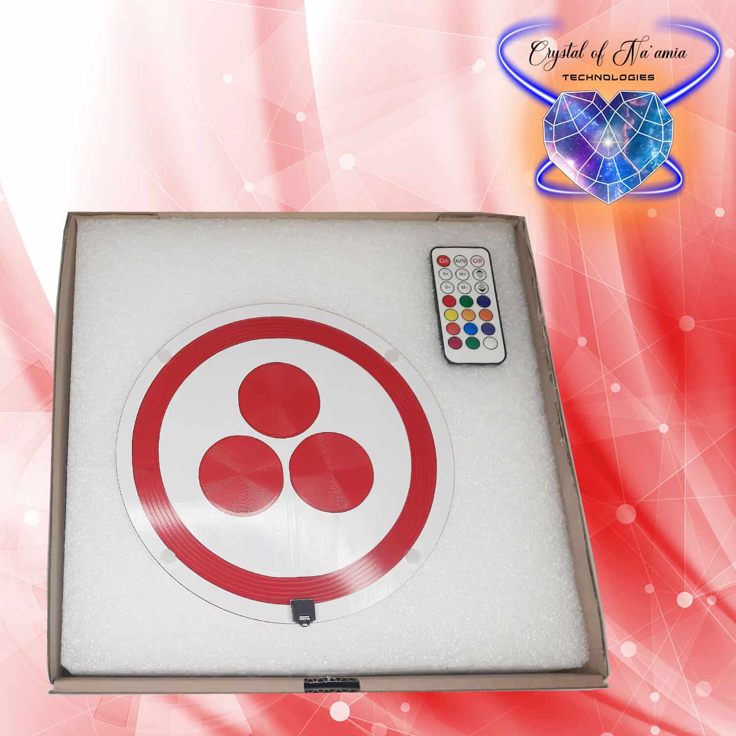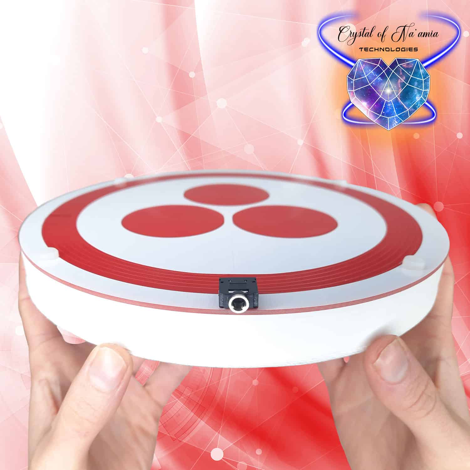 UNIVERSALIS PAX INCEPTIO est proposé en deux déclinaisons de schémas scalaires (ci-dessus) composés de 3 bobines secondaire interconnectées à un grand cercle composant la bobine primaire; une version d’un diamètre de 10 cm, illuminée et alimentable en fréquence via un jack audio 3,5 mm classique et un lecteur MP3, une version Magnus avec les mêmes propriétés mais un diamètre de 20 cm.