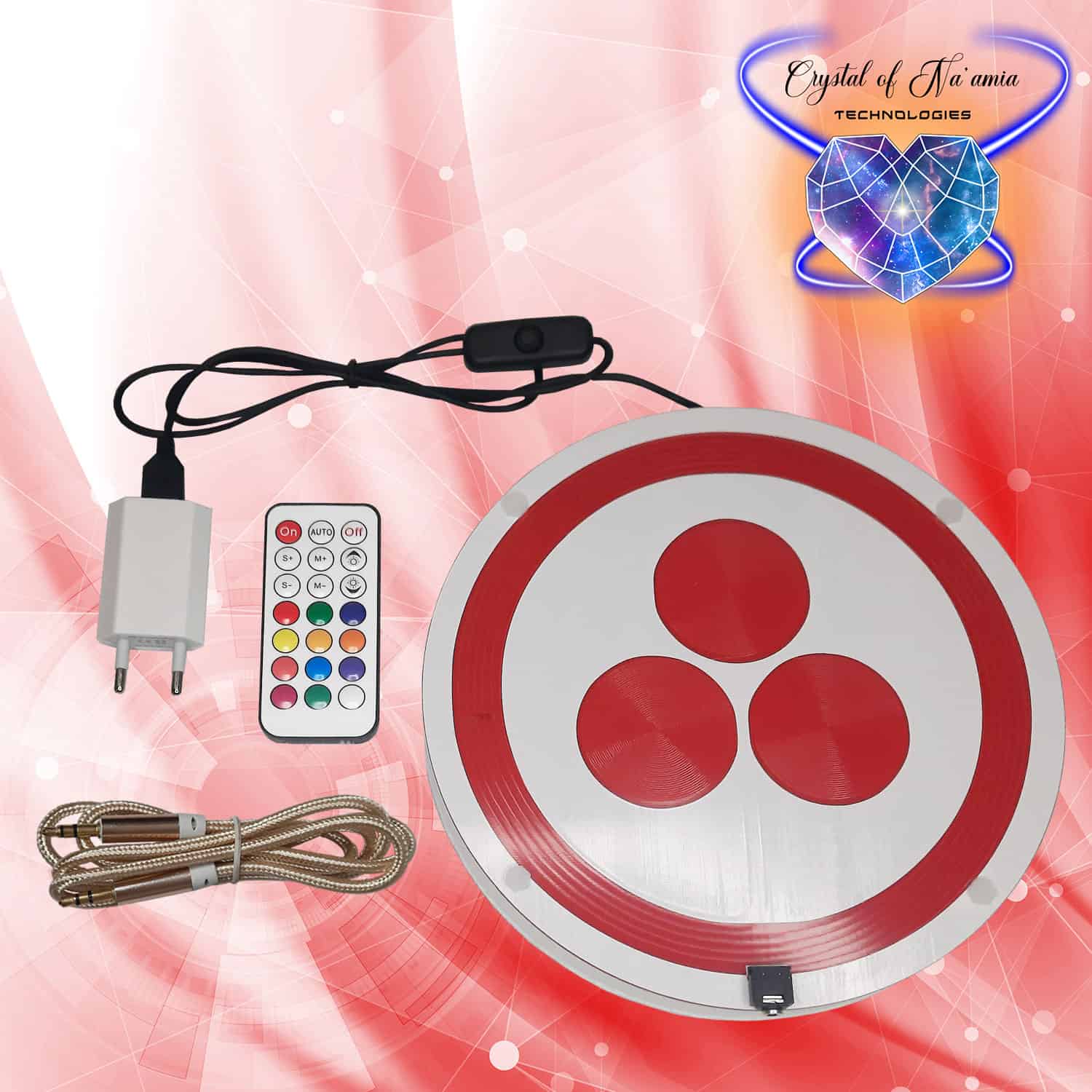 Transfo, câble jack audio et télécommande pour le réglage des animations LEDs RGB de la technologie fournis avec le dépliant explicatif, dans une boite protégée avec de la mousse.